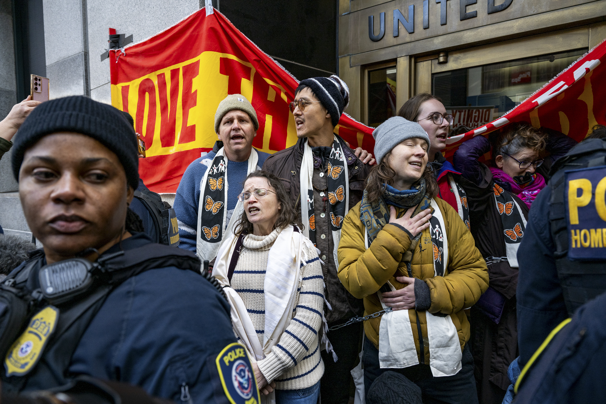 “The harm that’s being committed in these buildings when people are being taken from their families and then put into concentration camps far outweighs any concerns to any harm that may come from standing here today in solidarity with people who are just simply trying to live their lives in this country in freedom and dignity,” said Rabbi Cat Zavis, who was among those detained. “Our faith traditions and our spiritual traditions call us to disrupt injustice and stand with them.”