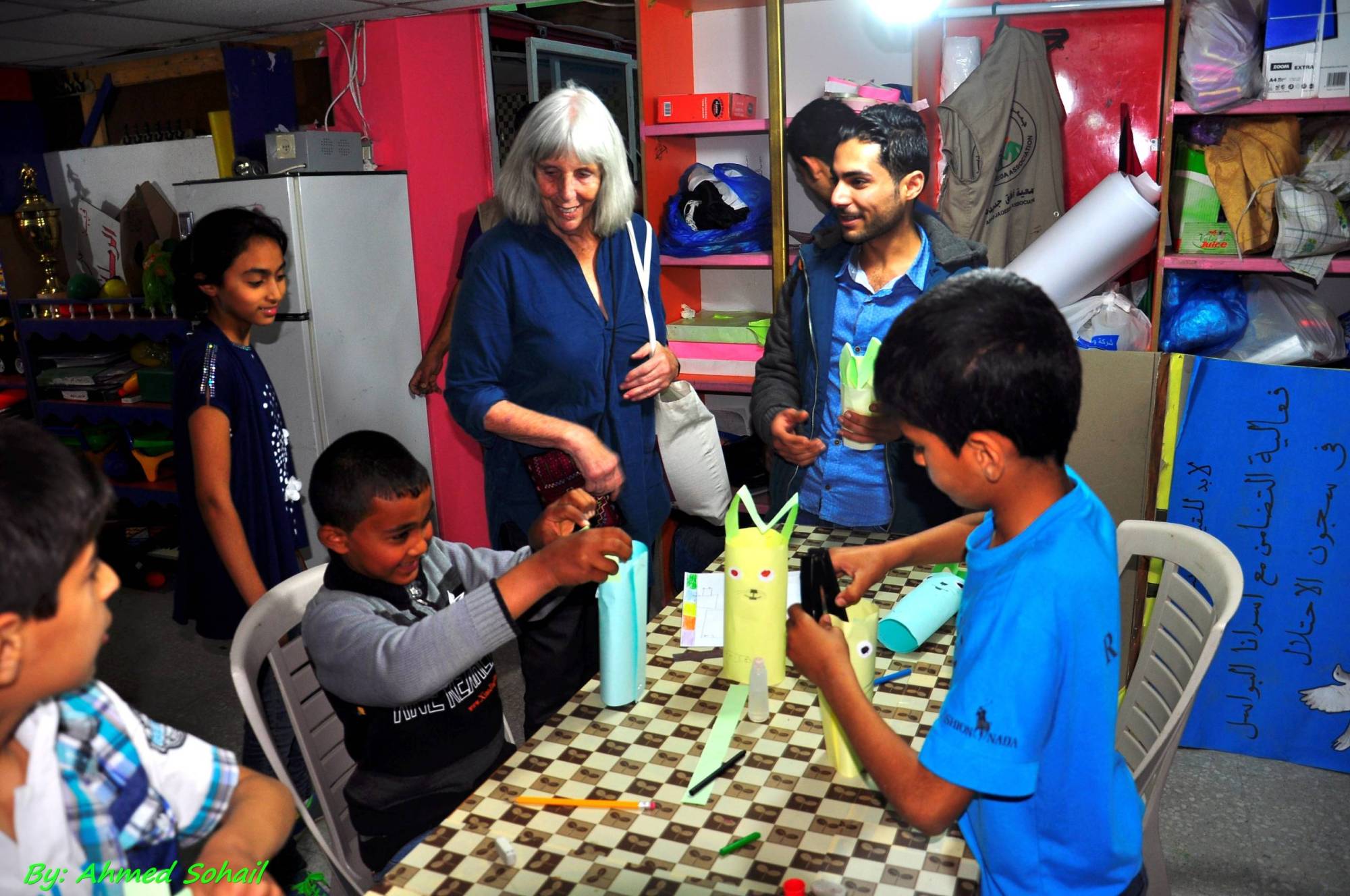 Barbara Lubin visits children making art in Gaza in 2012. (Courtesy of the Middle East Children's Alliance)