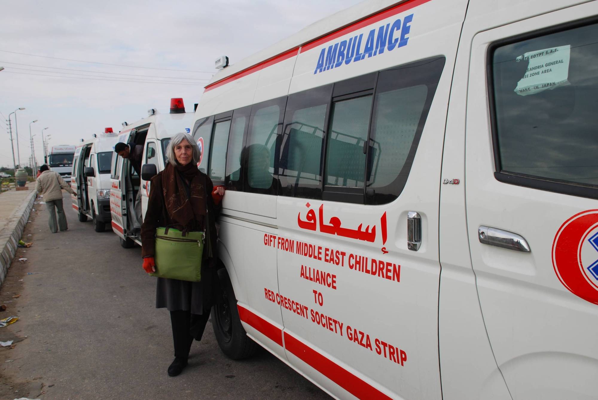 Barbara Lubin, co-founder of the Middle East Children’s Alliance, stands in Gaza in 2012 with an ambulance that the organization donated to the Red Crescent Society of the Gaza Strip. (Courtesy of the Middle East Children's Alliance)
