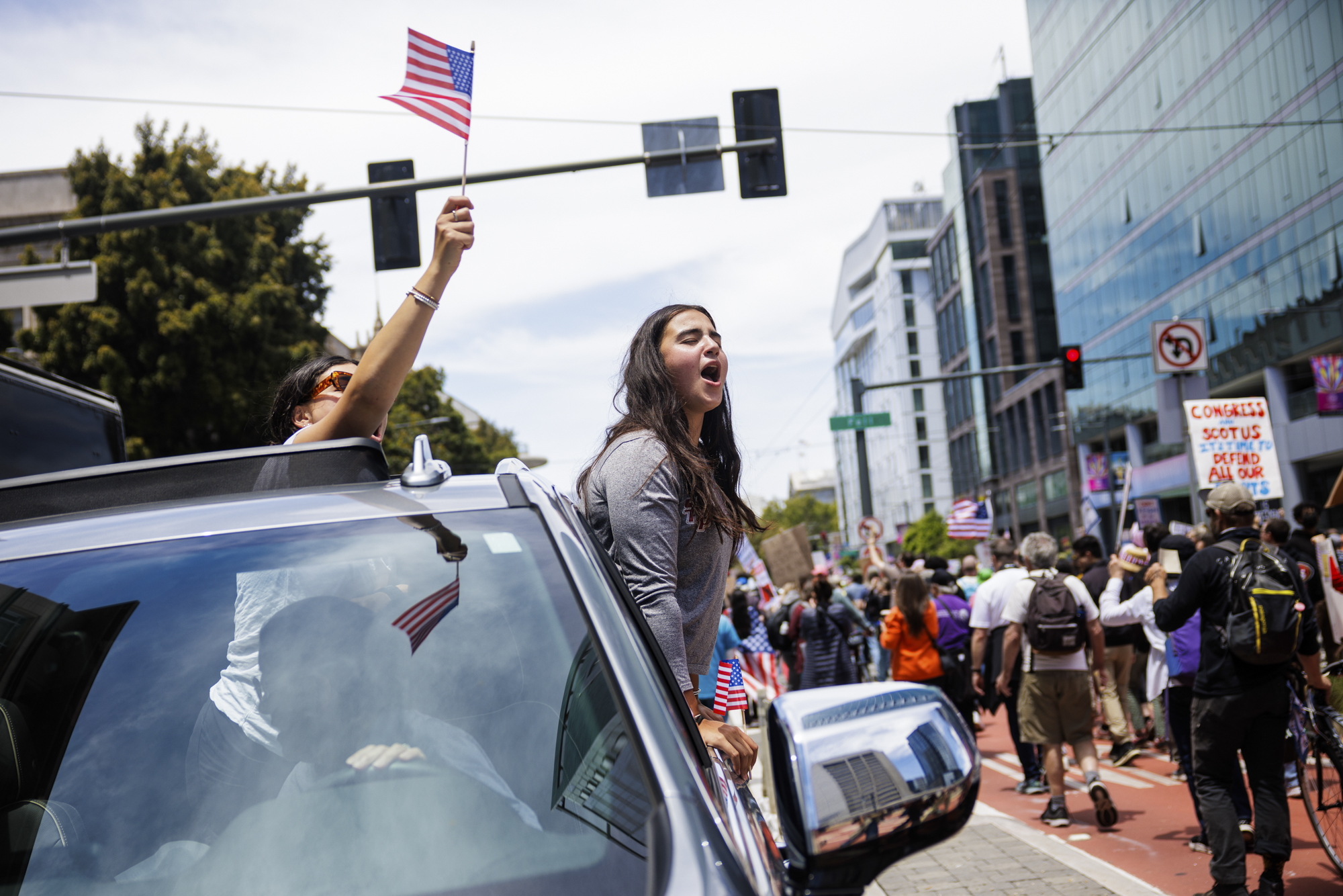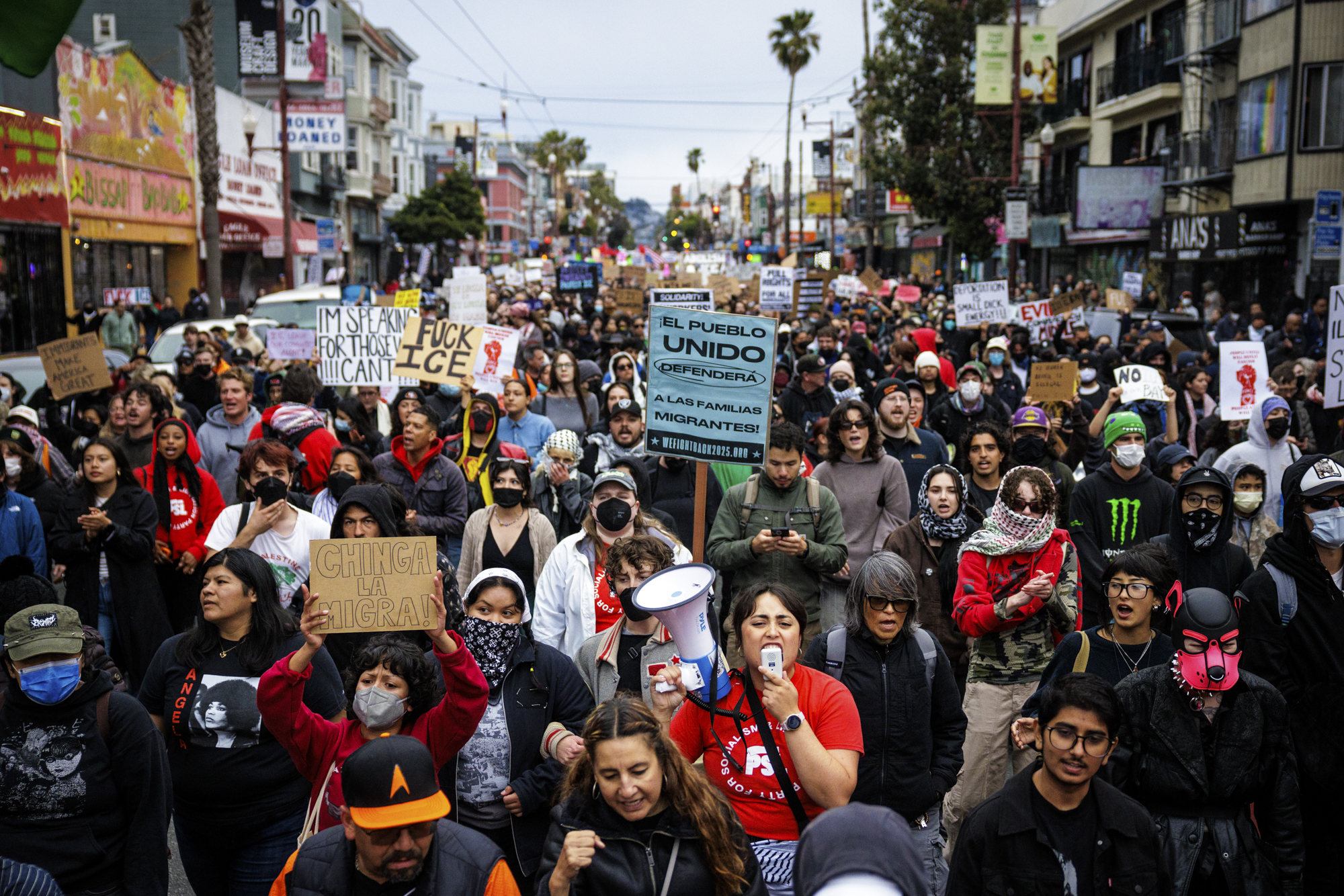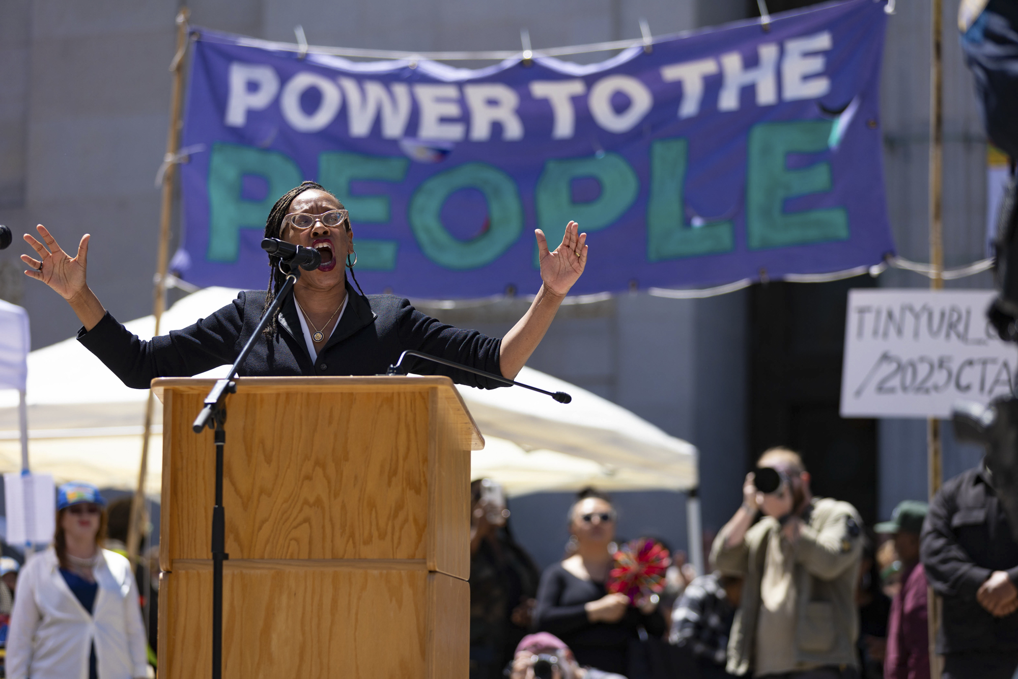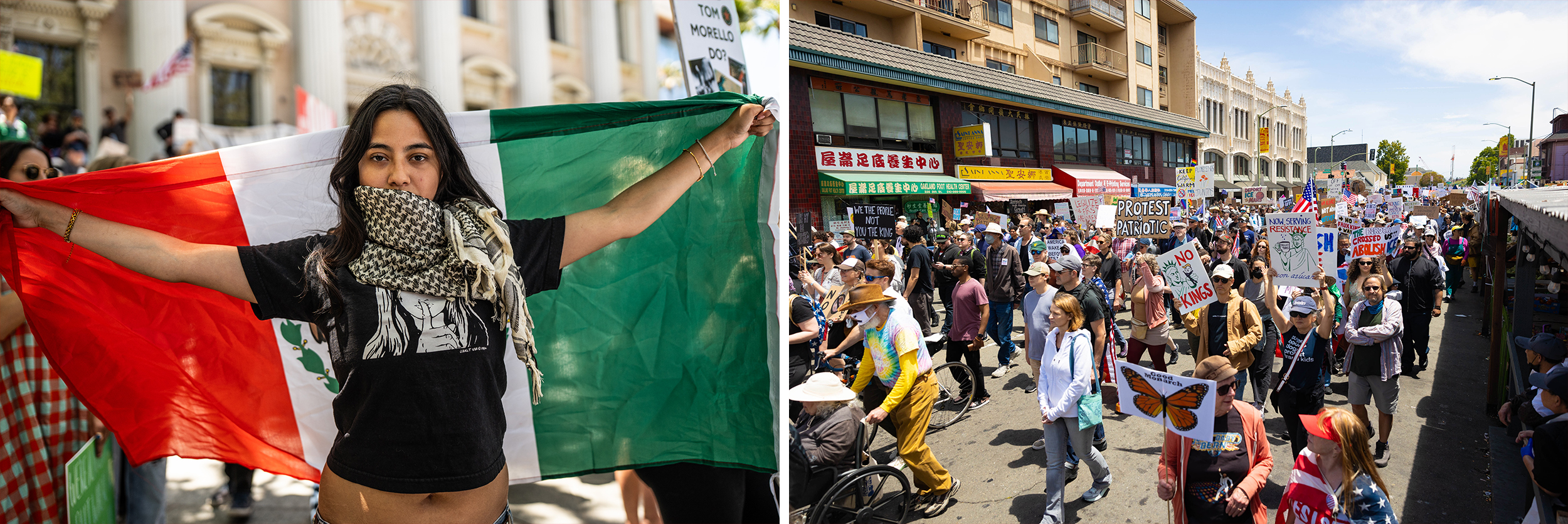 Jayvon Wilson (center) rallies alongside students, staff, and supporters outside the Treasure Island Job Corps Center in San Francisco on June 5, 2025, protesting the facility’s closure, which they say could leave at-risk youth homeless. (Beth LaBerge/KQED)Eric Garcia, who performs as Churro Nomi, co-director of Detour Productions and producer of the monthly queer cabaret Clutch The Pearls, poses for a photo at the Make Out Room in San Francisco on June 6, 2025. “This isn’t just about money, it’s about controlling narrative, visibility and power,” says Garcia, about arts organizations that have abandoned their DEI programming and reconfigured or erased their websites’ DEI commitments. “We’re witnessing a deliberate effort to police not only what stories are told, but who is allowed to tell them.” (Beth LaBerge/KQED)Protestors march in the Mission District in San Francisco in opposition to the Trump Administration’s immigration policy and enforcement on June 9, 2025. (Martin do Nascimento/KQED)Left: Daniella holds up a Mexican flag during a No Kings Day protest in San José on June 14, 2025. Right: Thousands of protesters march at the No Kings protest in Oakland on June 14, 2025. (Aryk Copley for KQED; Gina Castro/KQED)Supporters cheer from their cars as protesters march down Van Ness Ave. in San Francisco as part of the No Kings protest on June 14, 2025. (Martin do Nascimento/KQED)Congresswoman Lateefah Simon addresses hundreds of protesters at Frank H. Ogawa Plaza during the No Kings protest in Oakland on June 14, 2025. (Gina Castro/KQED)Left: People fill the courtyard at the Oakland Museum of California in Oakland for the Hella Juneteenth festival on June 19, 2025. Right: Festivalgoers dance at the Hella Juneteenth festival at the Oakland Museum of California on June 19, 2025. (Gina Castro/KQED)Jordyn Johnson, 9, gets the continent of Africa painted on her face at the Hella Juneteenth festival at the Oakland Museum of California on June 19, 2025. (Gina Castro/KQED)