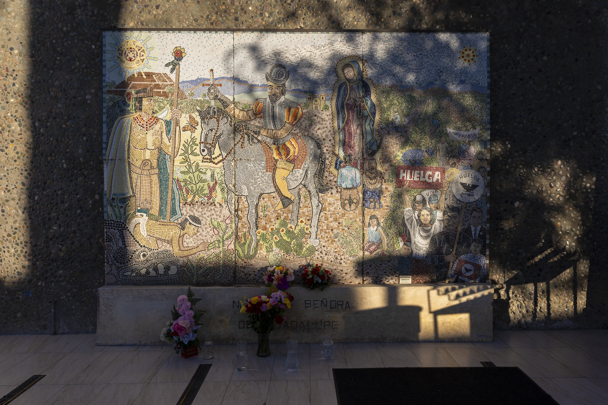 A mural decorates the exterior of Our Lady of Guadalupe Church, where Father Jon Pedigo has worked as a priest in San José on Dec. 3, 2025. Father Pedigo, who worked with immigrant communities affected by ICE raids and deportations, left his full-time job as a priest to be a full-time organizer. (Tâm Vũ/KQED)