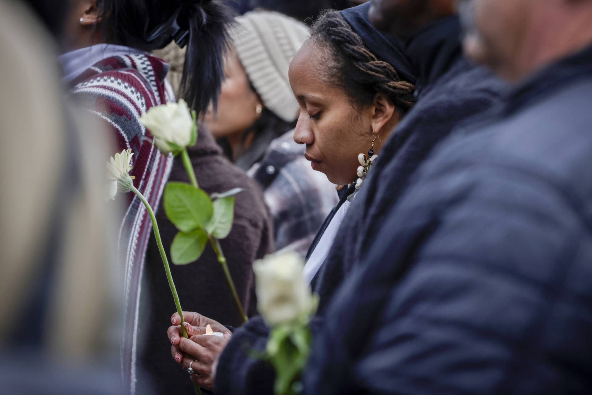 Tiffany Dobson joins a prayer with over 100 people in a vigil in Stockton on Nov. 30. "I can't stand for it," Dobson said, of the violence. The Central Valley community has stepped up to provide counseling for families of victims in the wake of the shooting at a children’s birthday party that killed four young people.