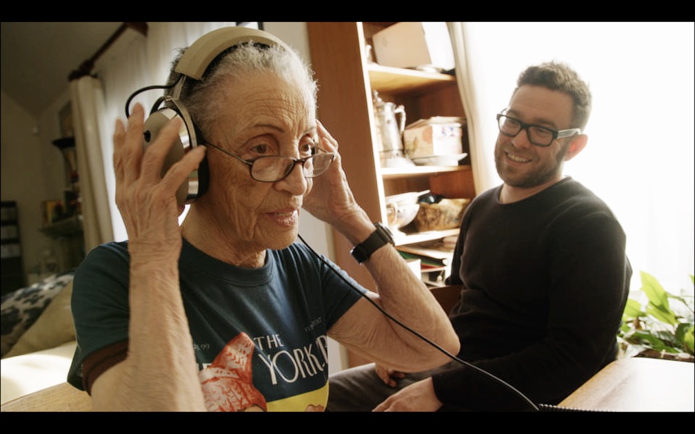Betty Reid Soskin listens to recordings of her own music as film director Bryan Gibel watches during the making of the documentary Sign My Name to Freedom: The Lost Music of Betty Reid Soskin. (Courtesy of Bryan Gibel)