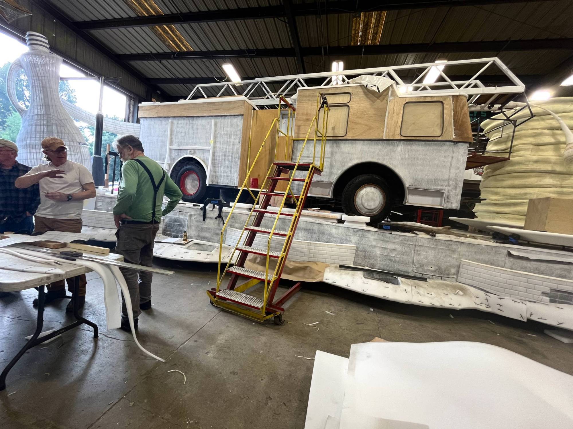 In the middle of the wide float deck sits a life-sized, replica firetruck built from scrap wood and metal.