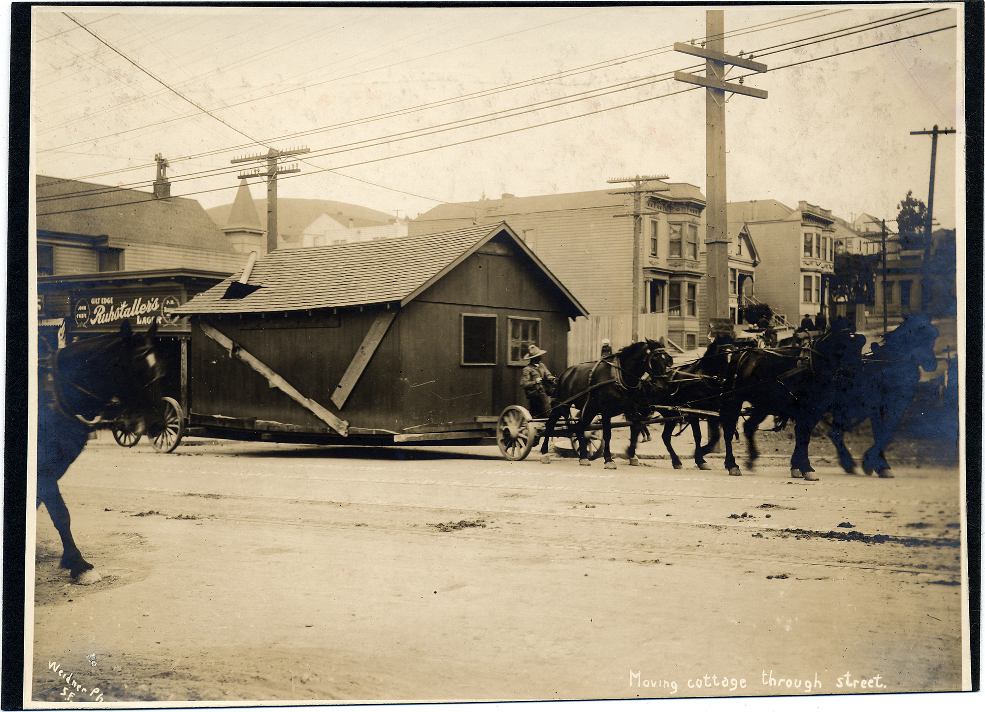 Katrina Schwartz: About a year and a half after the earthquake, in the summer of 1907, most of the shacks had been removed from the parks. Newspapers at the time described the surreal image of tiny homes on wagons moving across the city with people still in them.