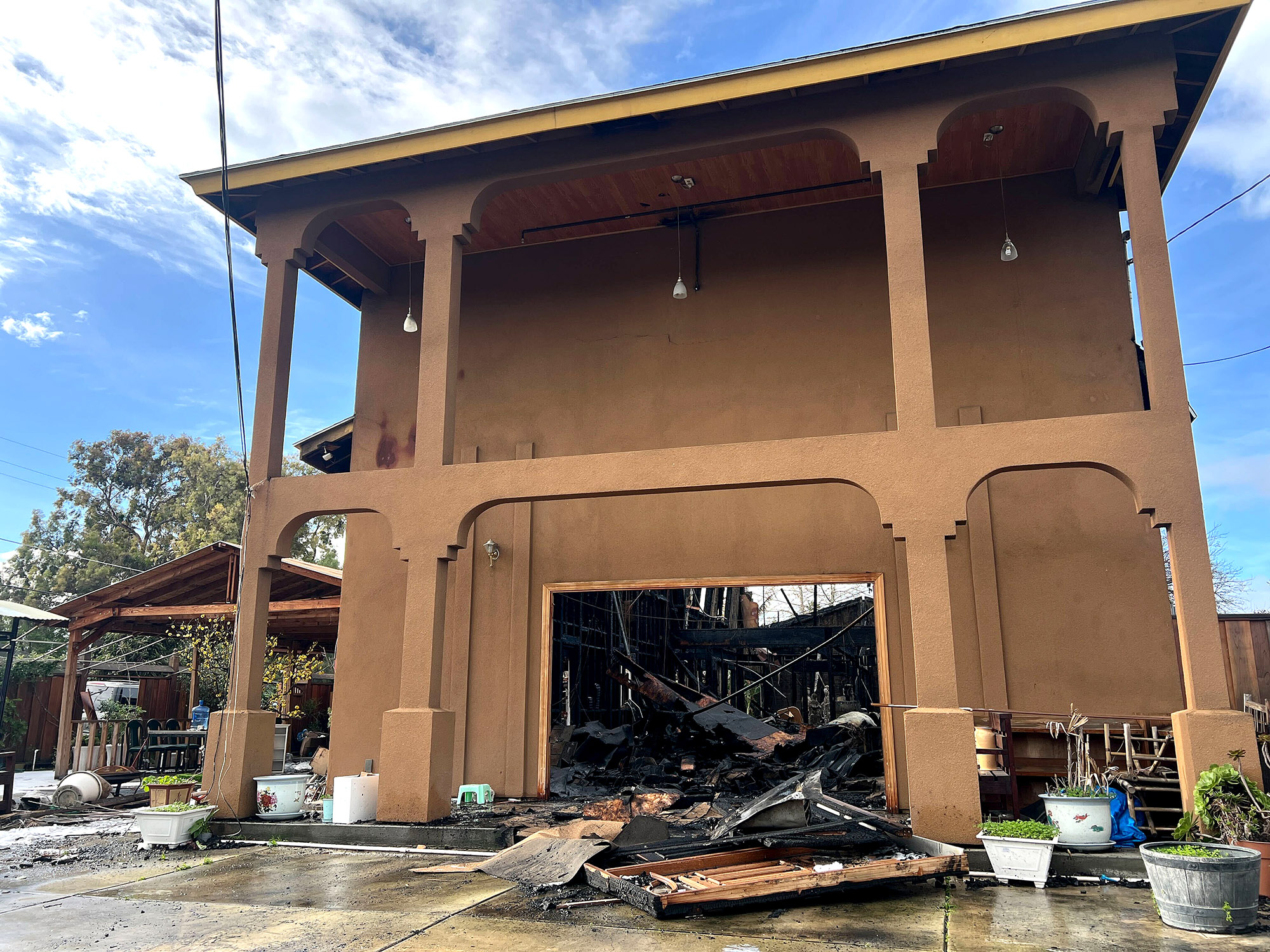 The debris of a shared fence and temple shelving lie scattered in David Ho’s backyard in San José on Jan. 5, 2026, after a three-alarm fire destroyed the neighboring Chua Duyen Giac Buddhist temple. Ho said he woke up to a view of flames at 5:30 a.m. and rushed his wife to their daughter’s home to escape the smoke and heat. (Ayah Ali-Ahmad/KQED)