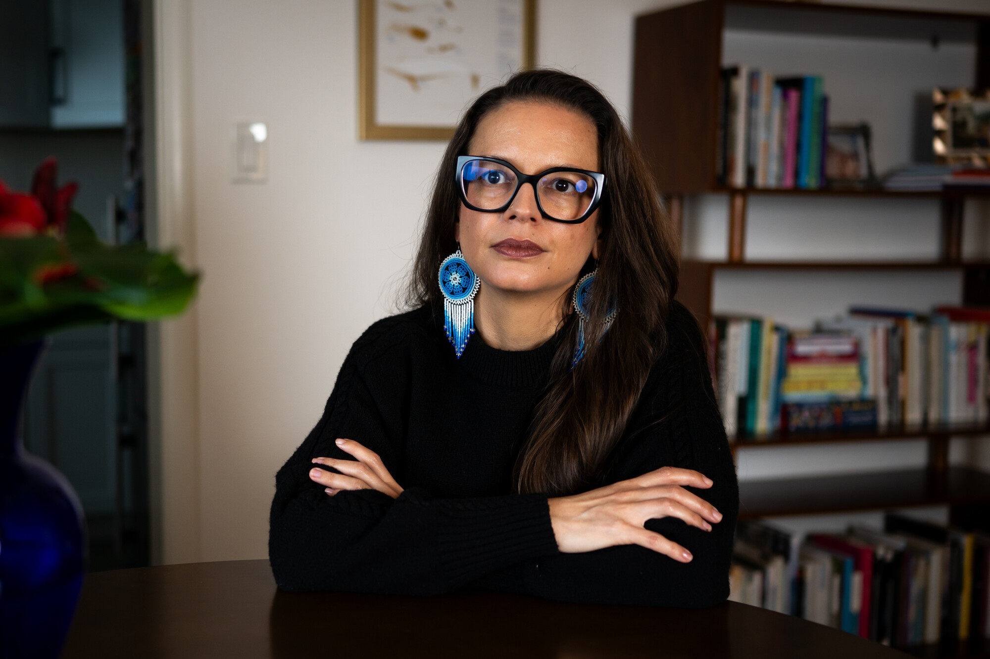 Carolina Morales sits in her apartment in San Francisco on Jan. 5, 2026. Morales, a Venezuelan American, is troubled by U.S. military intervention and uncertain about what comes next. (Beth LaBerge/KQED)
