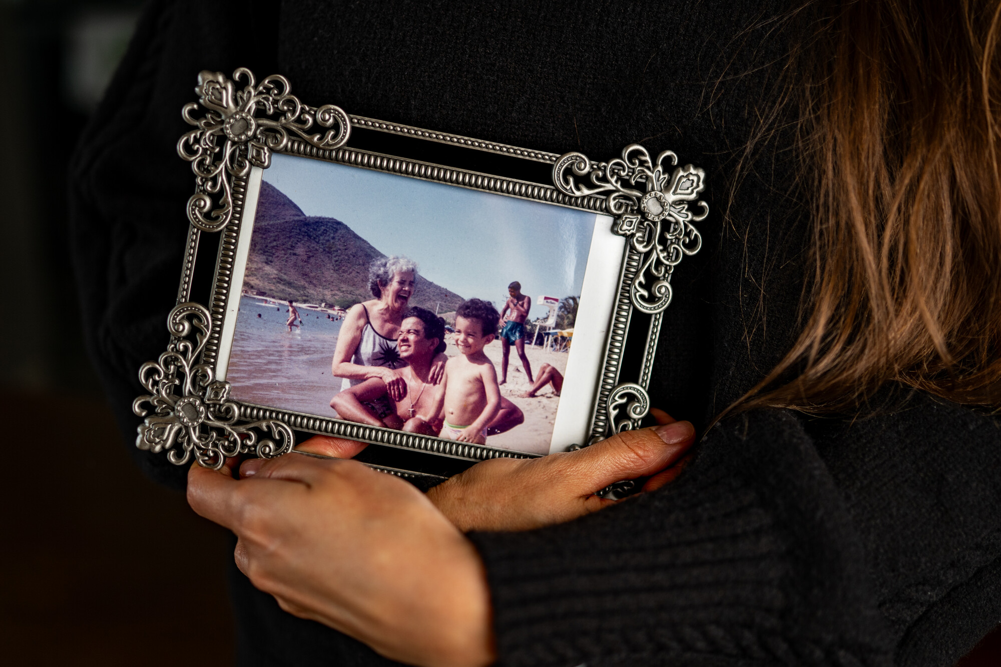 Carolina Morales holds a photo of her family on a beach in Venezuela in her apartment in San Francisco on Jan. 5, 2026. Morales, a Venezuelan American, is troubled by U.S. military intervention and uncertain about what comes next. (Beth LaBerge/KQED)