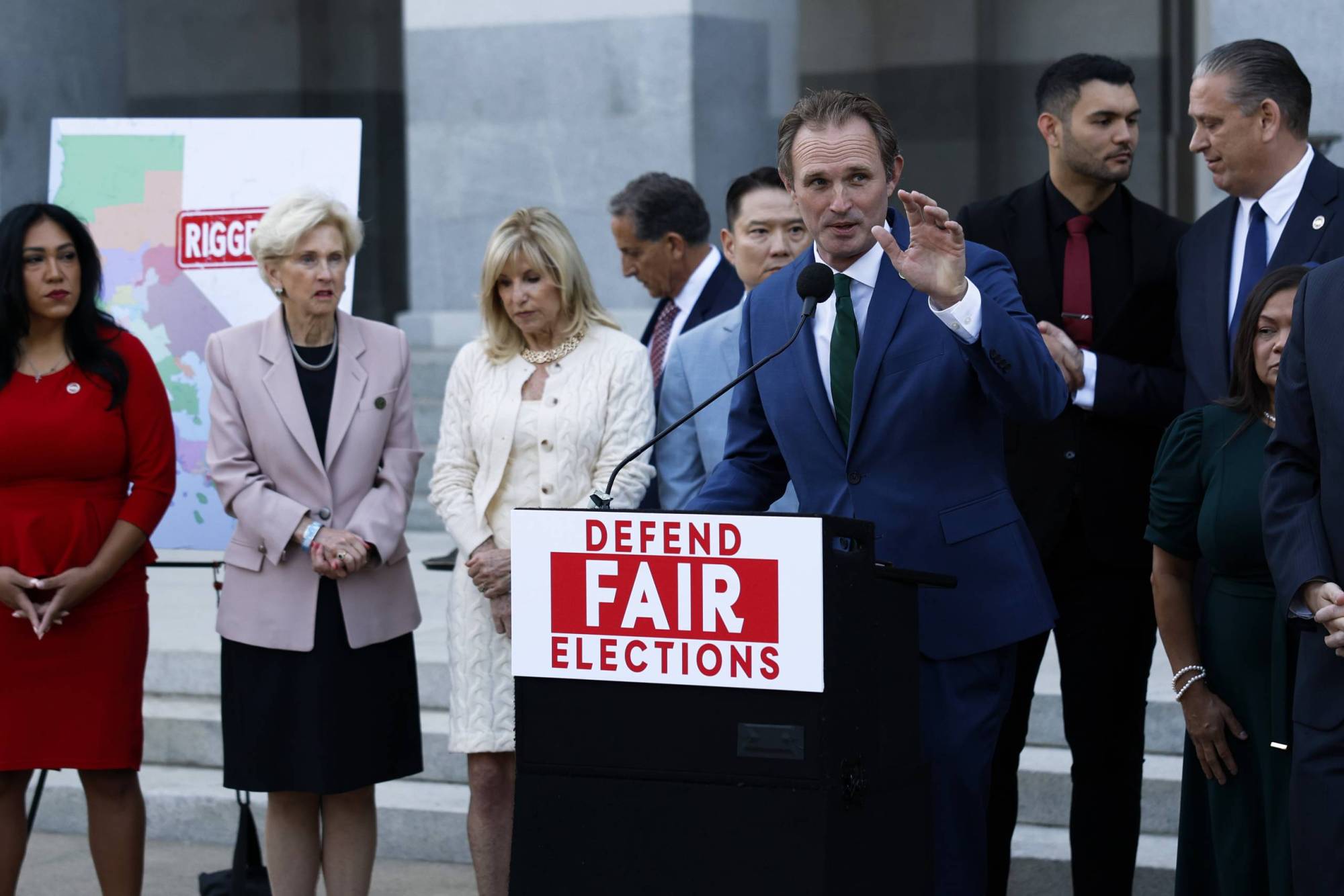 Republican Assembly member James Gallagher speaks during a press conference ahead of a meeting of the California State Assembly at the California State Capitol on Aug. 21, 2025, in Sacramento, California. (Justin Sullivan/Getty Images)