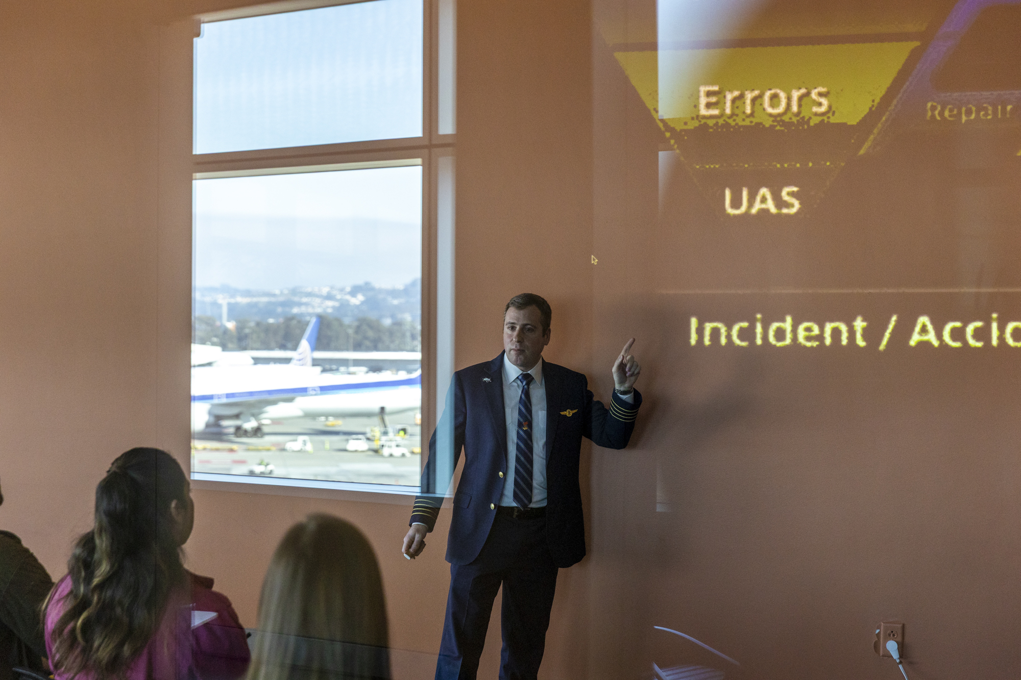 Captain Daniel Stellini gives a presentation at the Fear of Flying workshop at the Reflection Room at San Francisco International Airport in San Francisco on Dec. 13, 2025. (Tâm Vũ/KQED)
