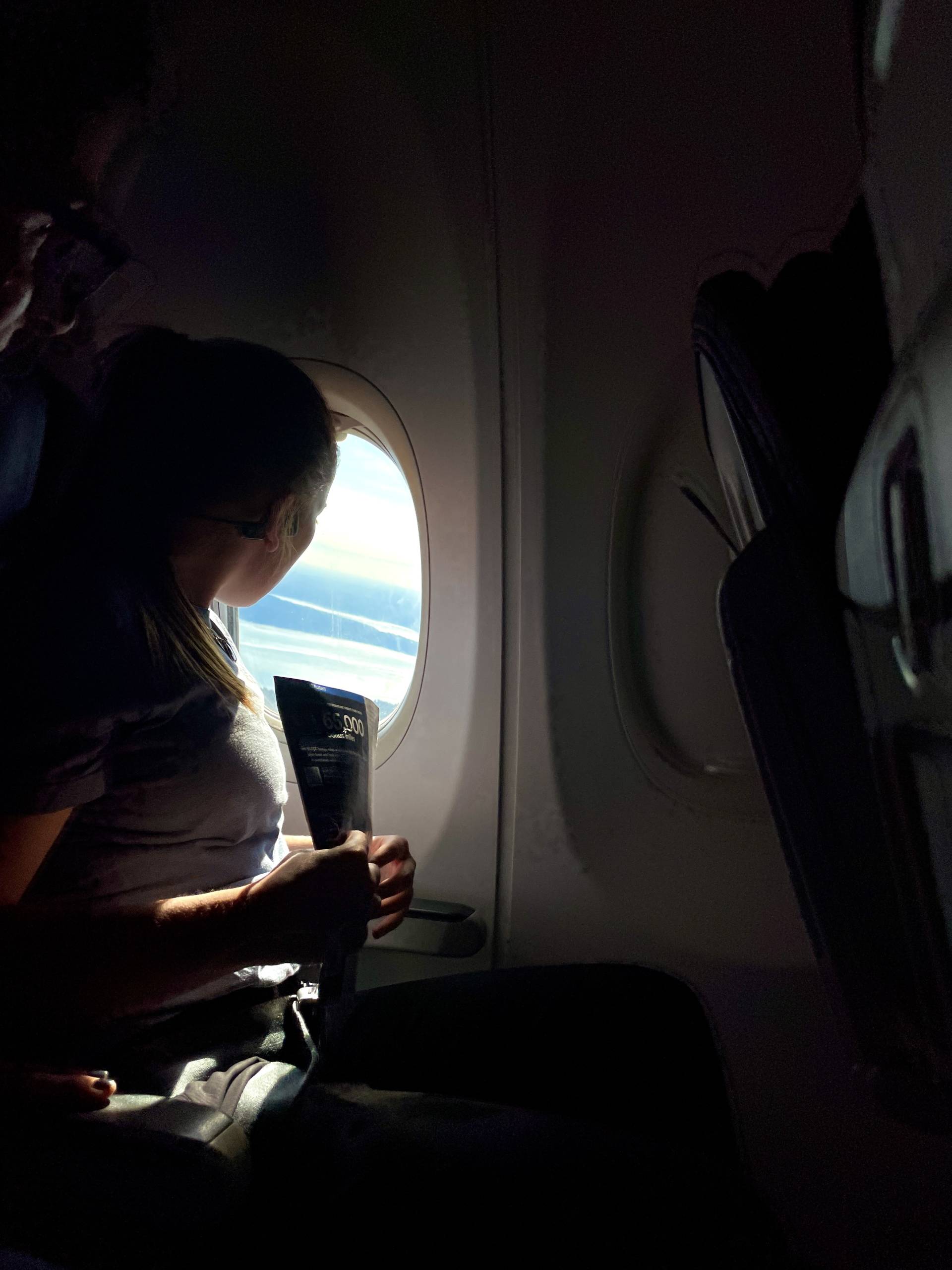 Collette Vance looks out the window before takeoff from San Francisco on Aug. 10, 2025. (Evan Roberts/KQED)