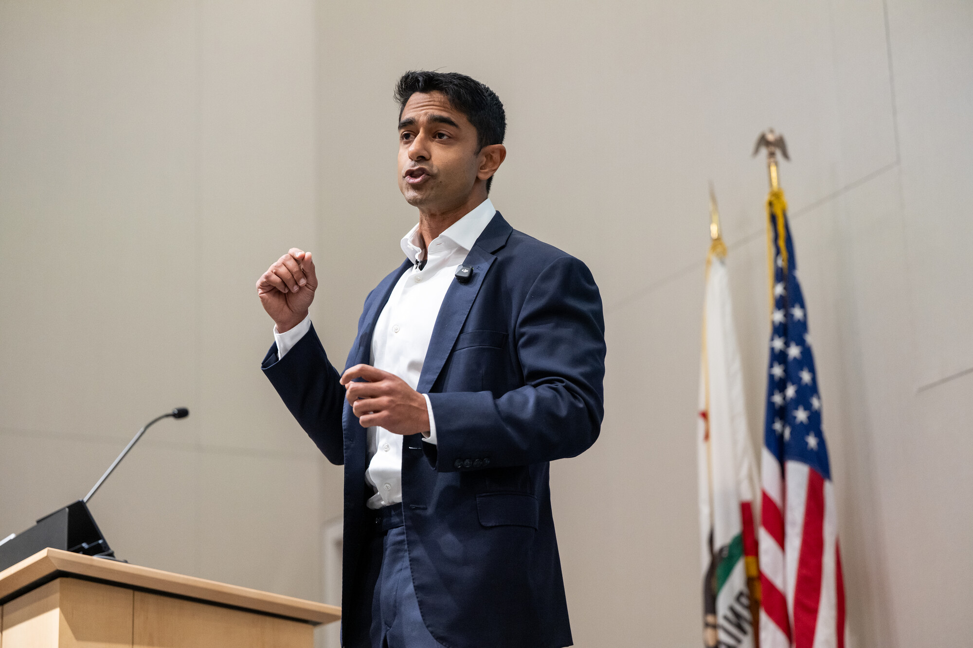 Saikat Chakrabarti, a candidate for California’s 11th Congressional District, participates in a forum with other candidates at UC Law San Francisco on Jan. 7, 2026. (Beth LaBerge/KQED)