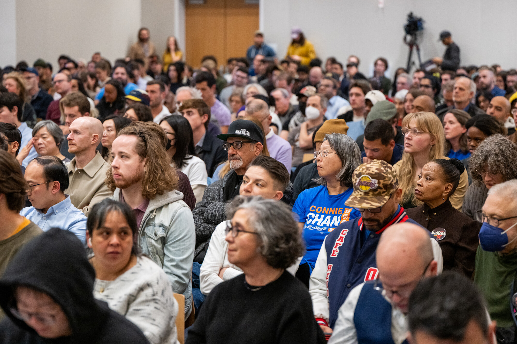 Attendees watch a forum with candidates running for California’s 11th Congressional District, Saikat Chakrabarti, state Sen. Scott Wiener and San Francisco Supervisor Connie Chan, at UC Law San Francisco on Jan. 7, 2026. (Beth LaBerge/KQED)