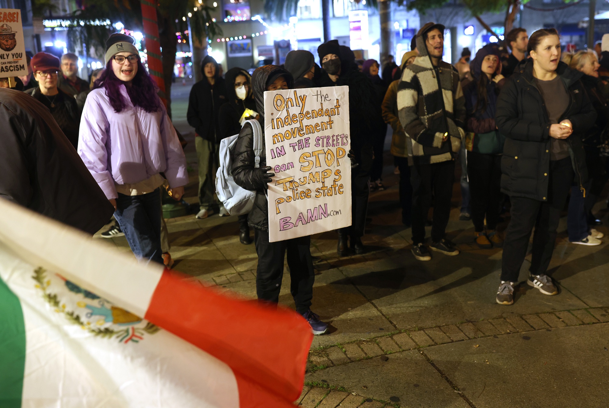 Protesters take part in a vigil for Renee Nicole Good at Fruitvale Plaza in Oakland, California, on Wednesday, Jan. 7, 2026. (Jane Tyska/Digital First Media/East Bay Times via Getty Images)