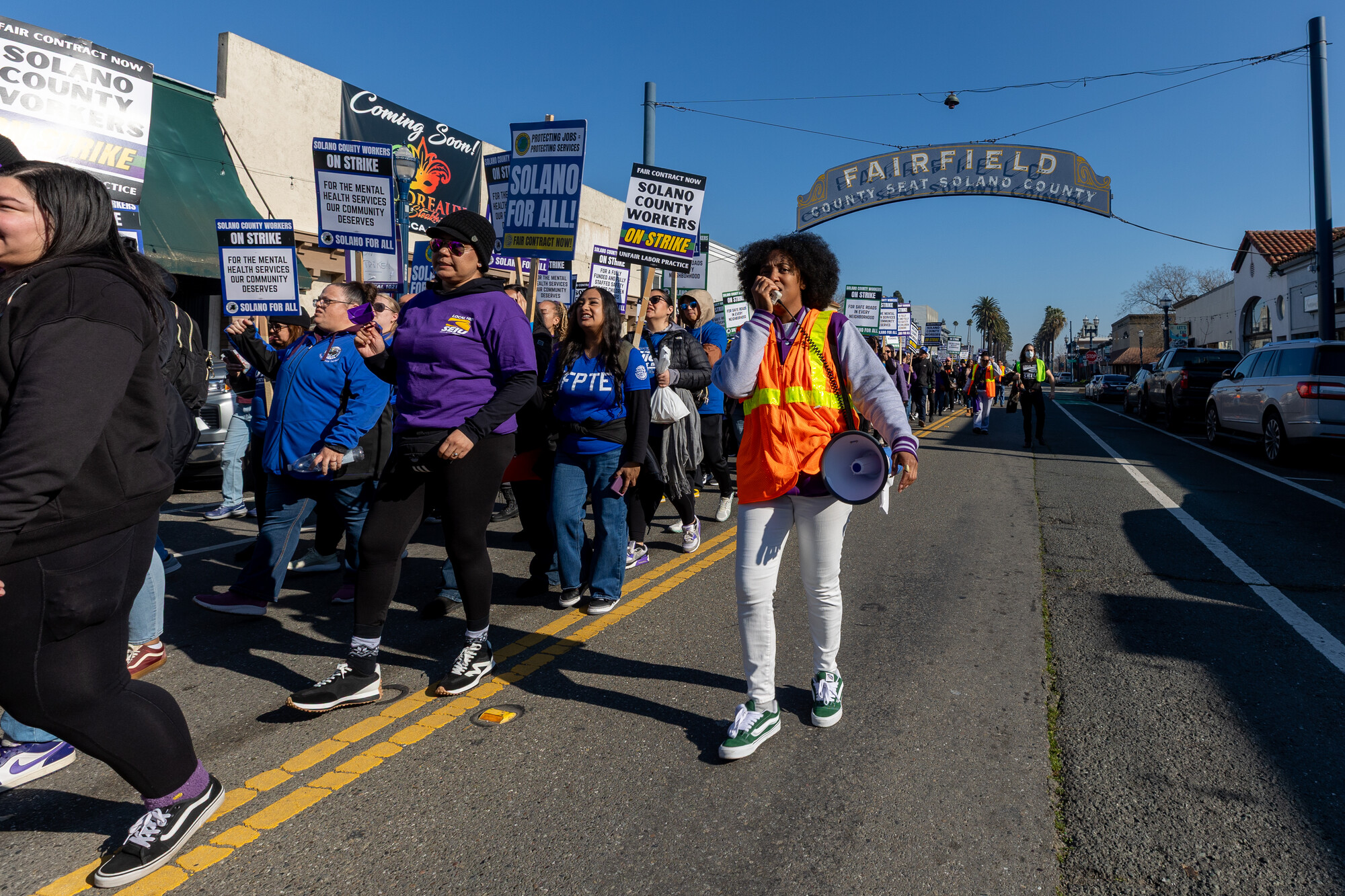 Demonstrators move through downtown Fairfield as Solano County workers continued a countywide strike over stalled contract negotiations on Jan. 13, 2026. (Gustavo Hernandez/KQED)