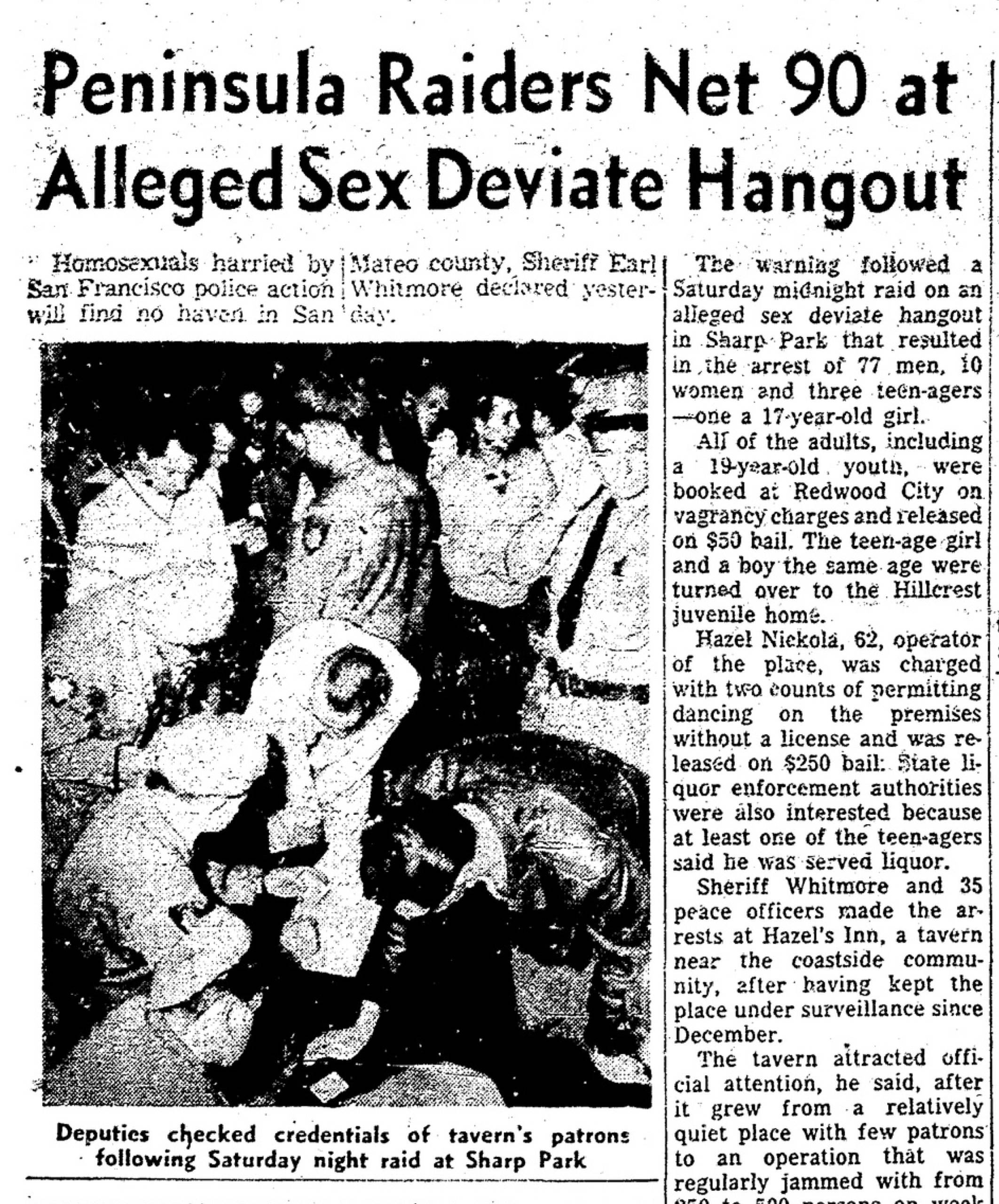 Voice Over 1: San Francisco Examiner: Ninety persons, mostly men, were booked at the San Mateo County jail yesterday after a vice raid on a tavern suspected of being a gathering place for sex deviates.