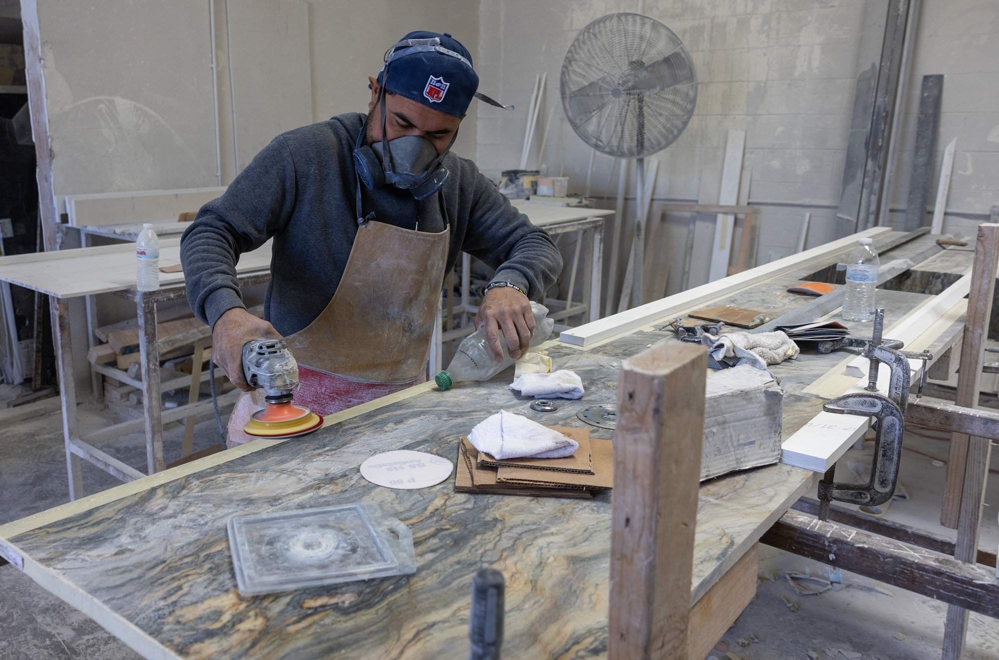 A stone countertop fabricator wears a mask to help protect against airborne particles, which can contribute to silicosis, at a shop on Oct. 31, 2023, in Sun Valley, California. (Brian van der Brug/Los Angeles Times via Getty Images)