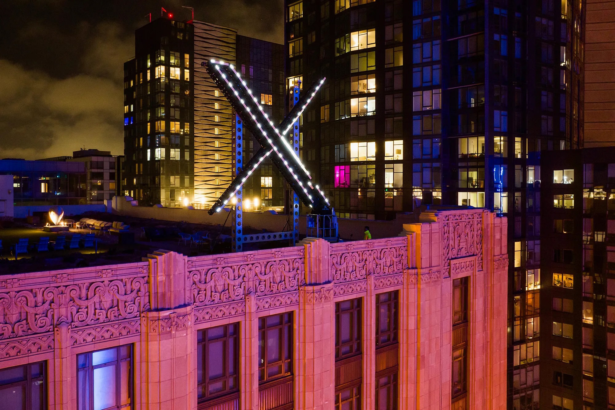 Workers install lighting on an "X" sign atop the company headquarters in downtown San Francisco on July 28, 2023. Attorney General Rob Bonta said his office is looking into whether a new AI image editing tool from Elon Musk’s company violates California law. (Noah Berger/AP)