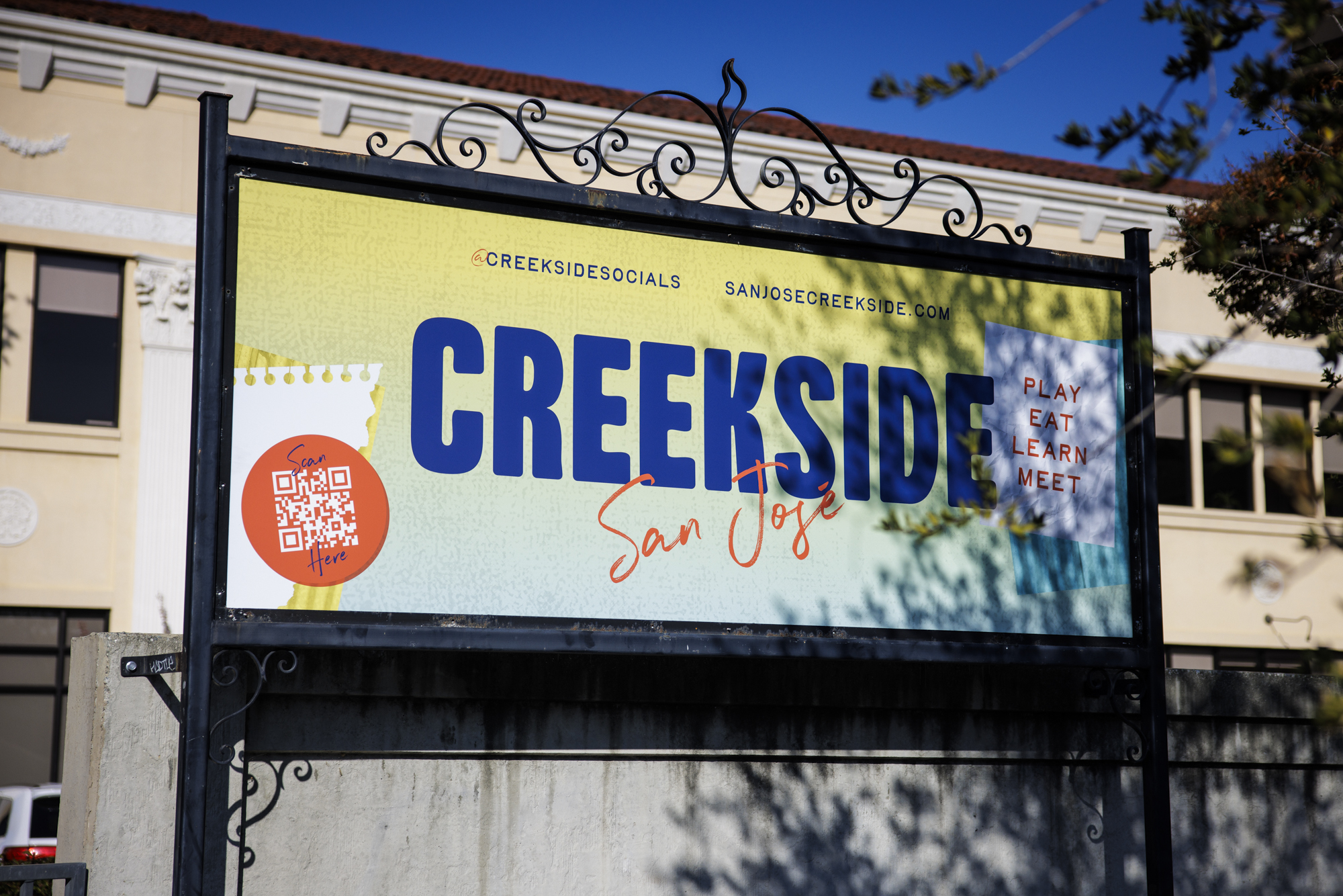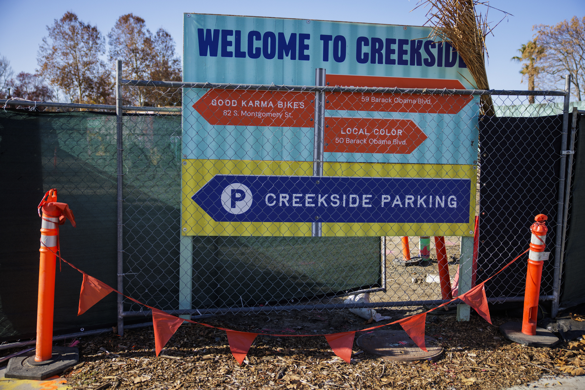 A sign for Creekside San José in San José on Dec. 8, 2025. Google's plans to reshape acres of downtown San José have not been realized, leaving locals playing a waiting game. (Martin do Nascimento/KQED)