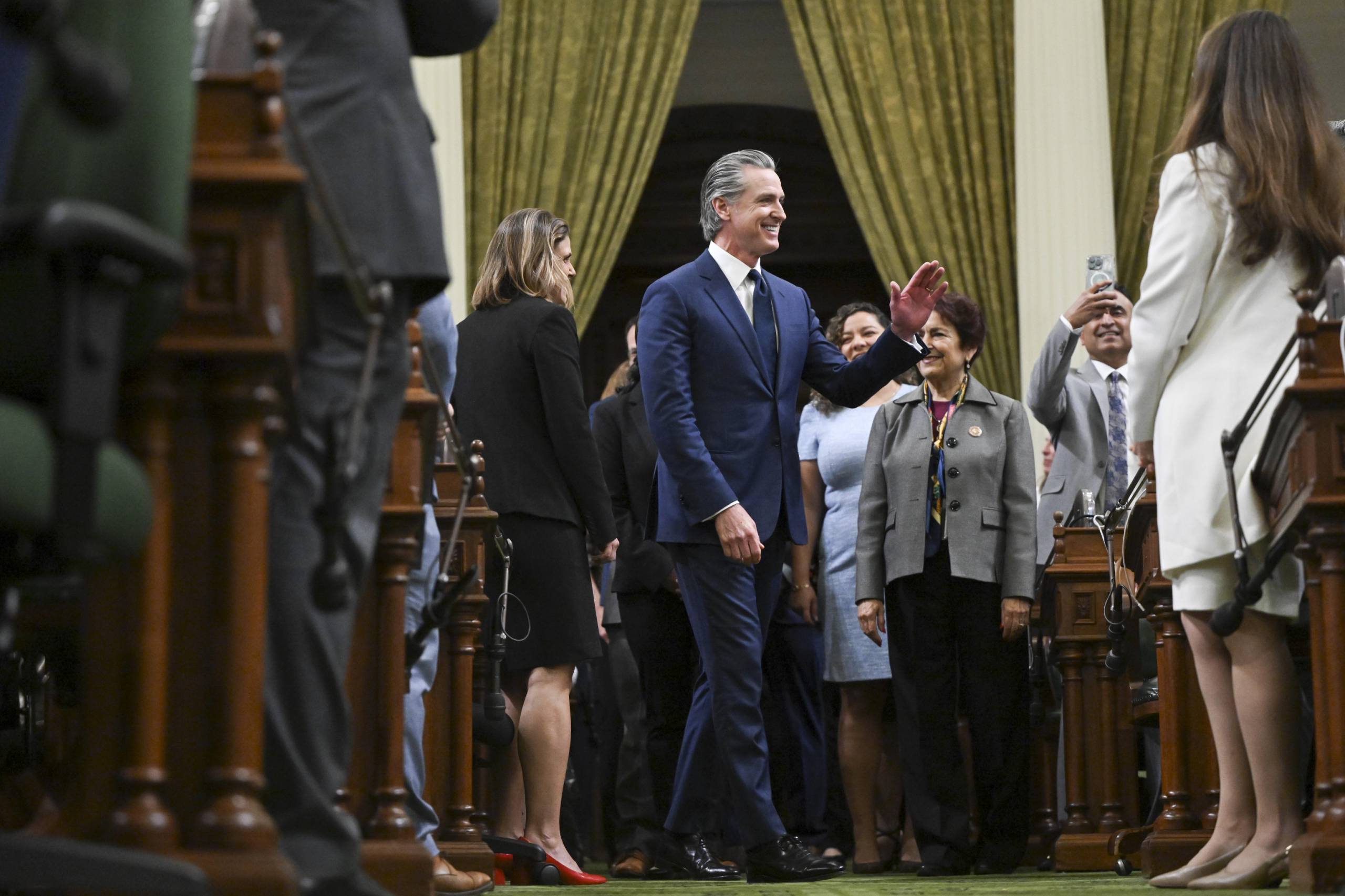 Gov. Gavin Newsom greets legislators as he arrives at the state Capitol in Sacramento to give his final State of the State address as governor on Thursday, Jan. 8, 2026. (Hector Amezcua/The Sacramento Bee)