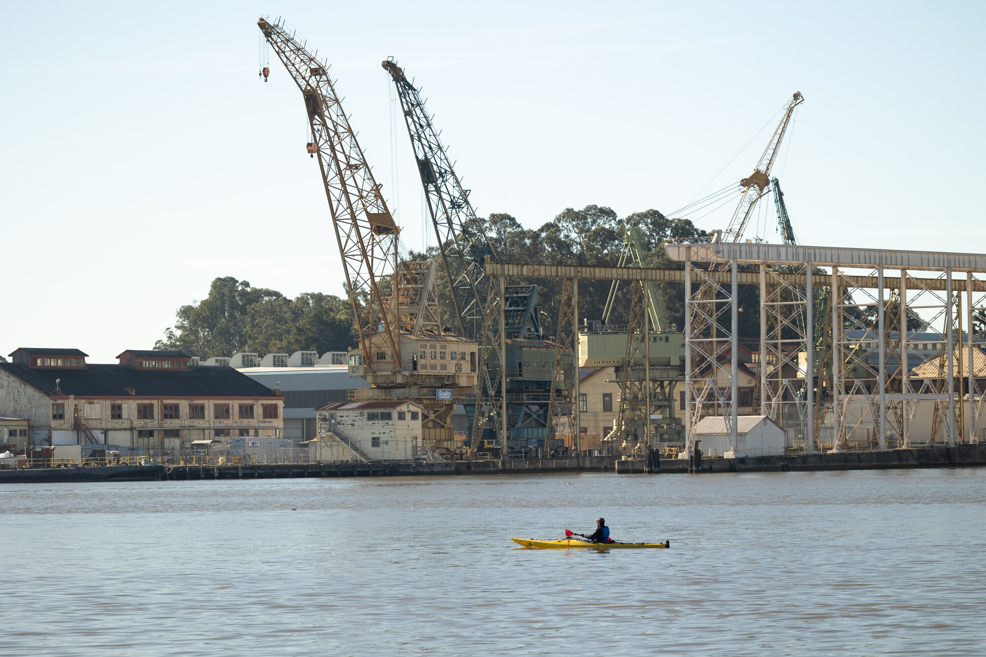 A kayaker floats down the Napa River past the Navy Yard of Mare Island in the city of Vallejo on Jan. 14, 2025. The company California Forever and its partners are urging the federal government to designate the California Delta a “Maritime Prosperity Zone” aimed at creating jobs and attracting investment. (David M. Barreda/KQED)