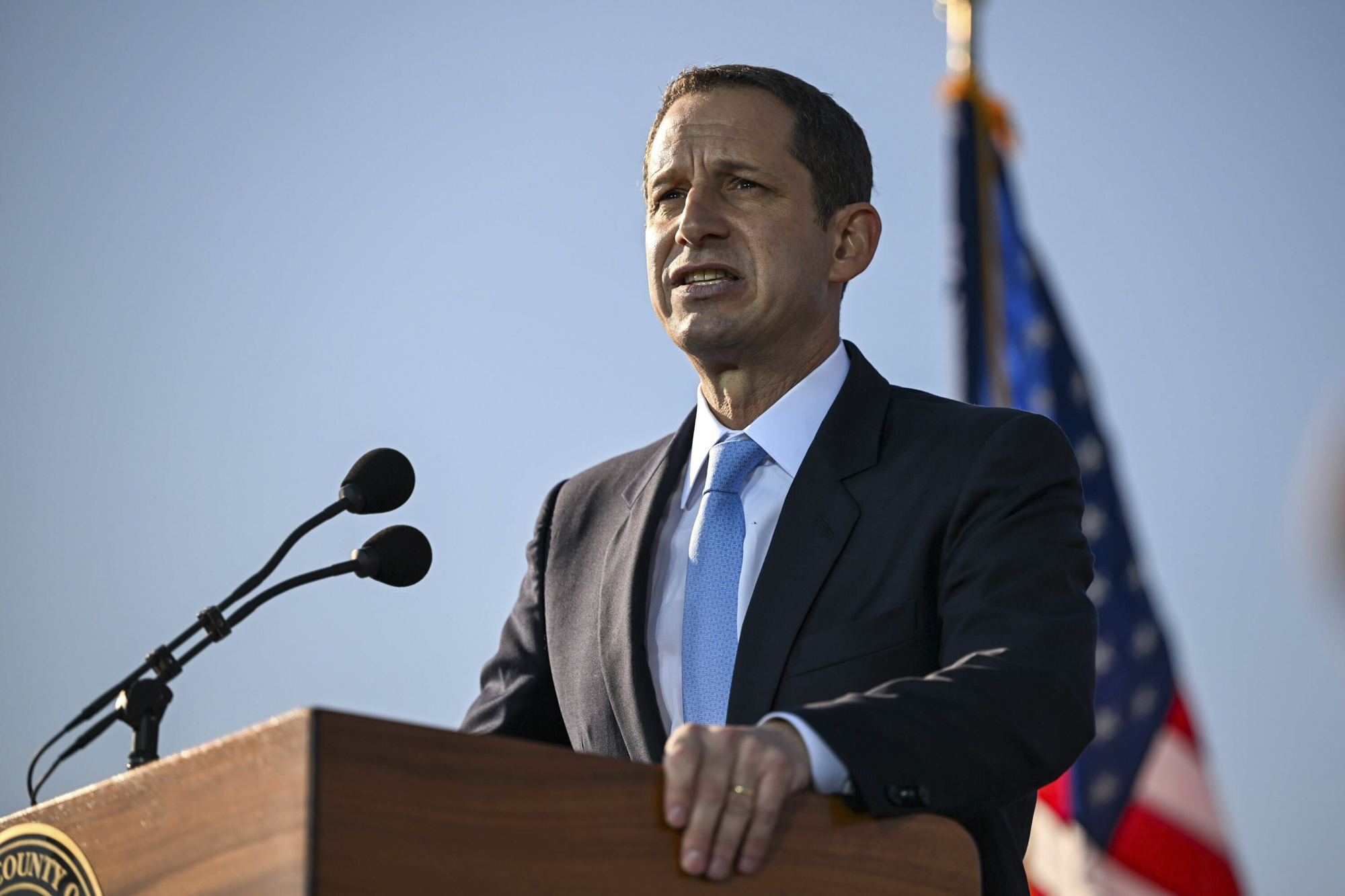 San Francisco Mayor Daniel Lurie gives remarks during a State of the City address at Rossi Park Ball Field in the Richmond neighborhood of San Francisco on Jan. 15, 2026. (Beth LaBerge/KQED)