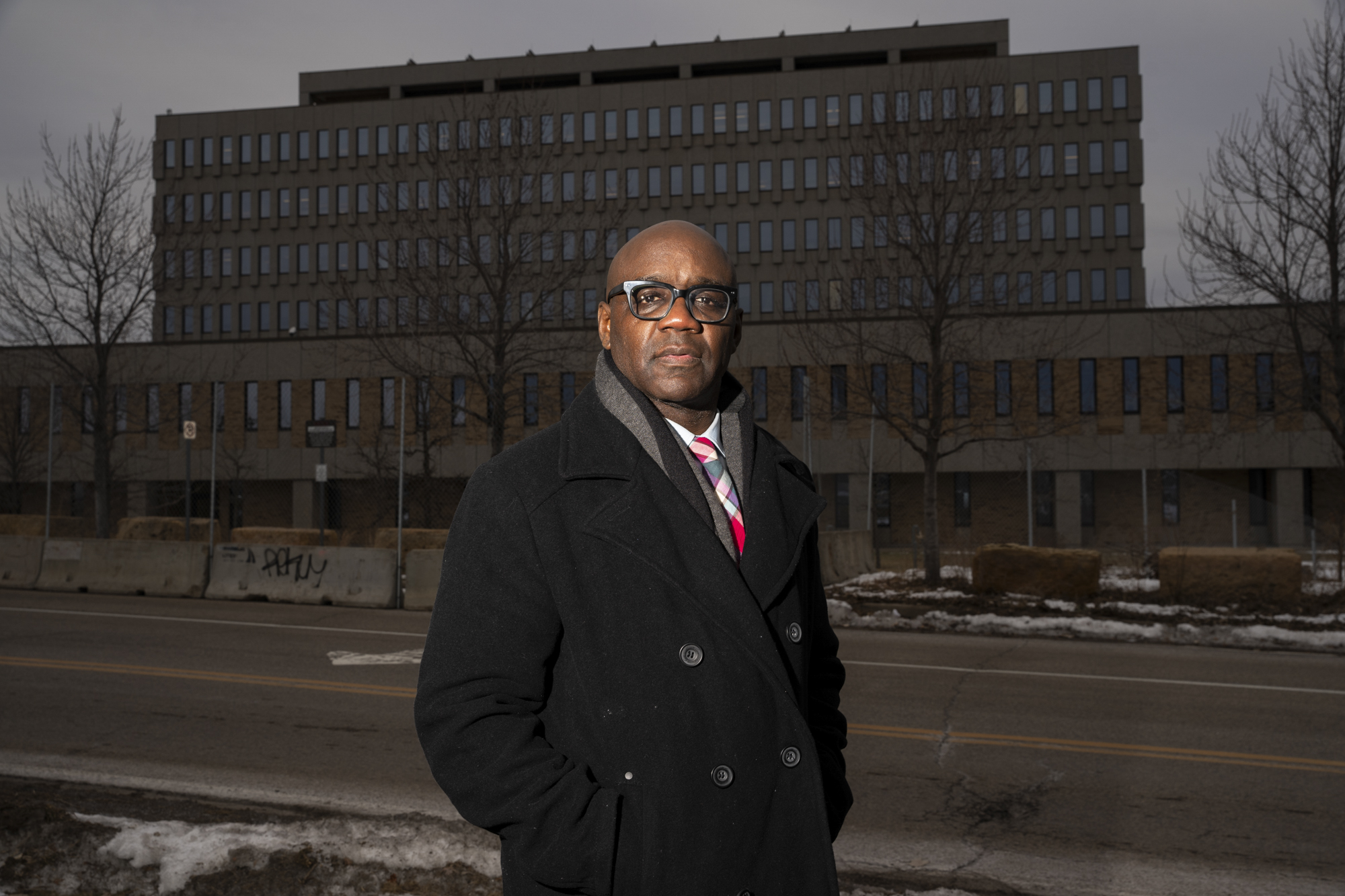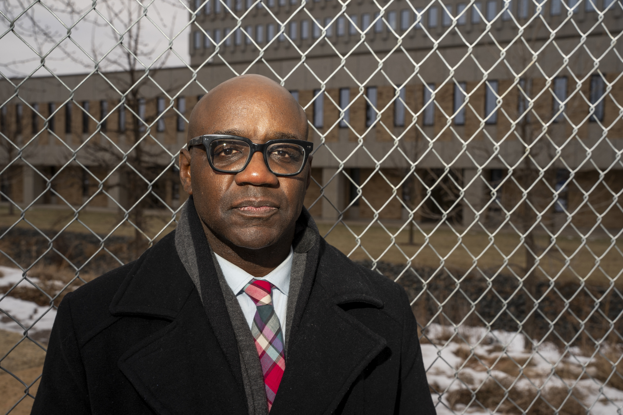 Attorney James Cook stands for a portrait outside of the Bishop Henry Whipple Federal Building in Minneapolis, Minnesota on Jan. 15, 2026. Cook has been offering pro-bono legal services to the immigrants and anti-ICE protesters swept up in the Trump administration’s massive law enforcement operation in Minnesota. (Evan Frost for KQED)