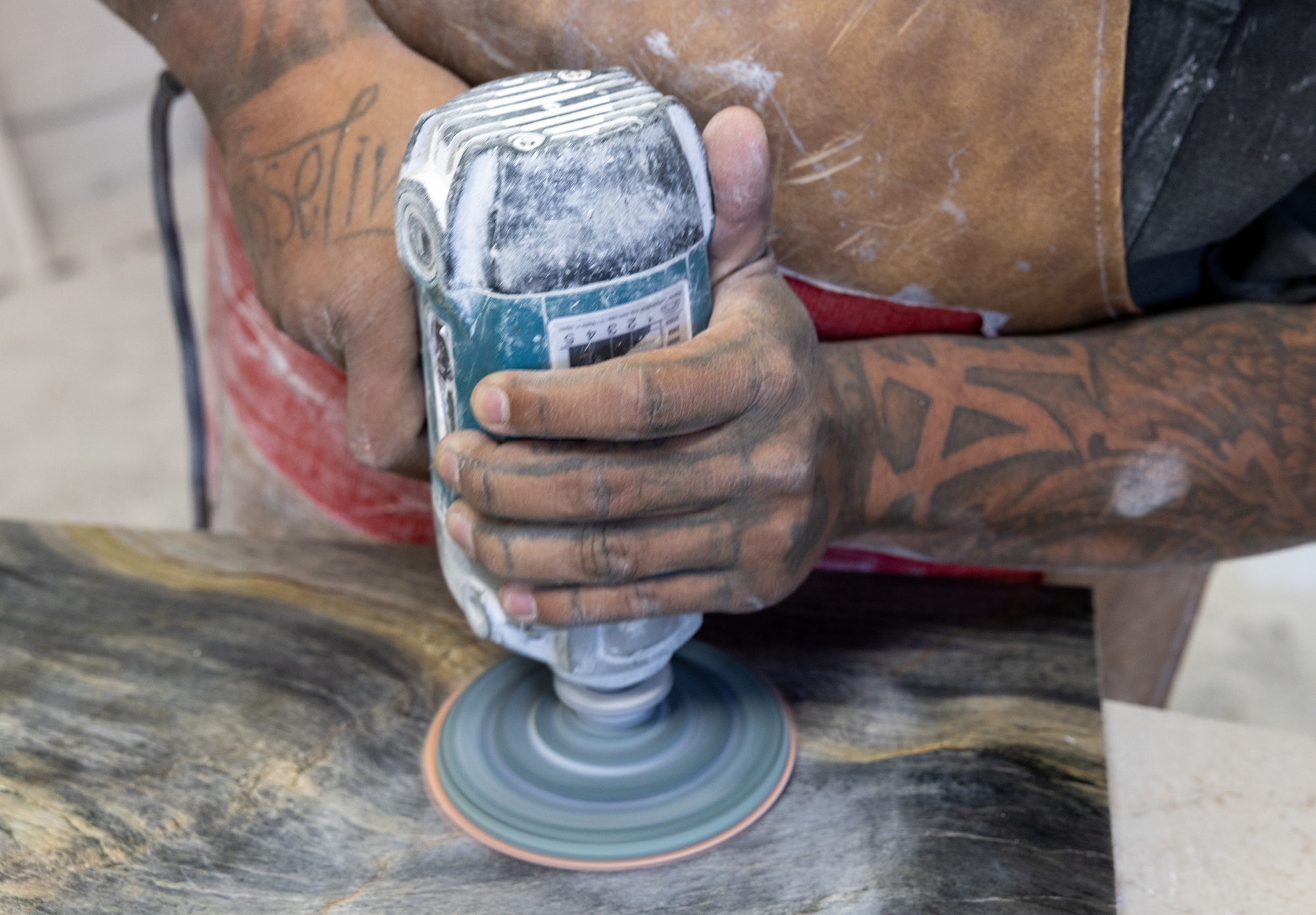 A stone fabricator places his hand on a table that he cut at his home in San Francisco on Oct. 17, 2023. (Beth LaBerge/KQED)