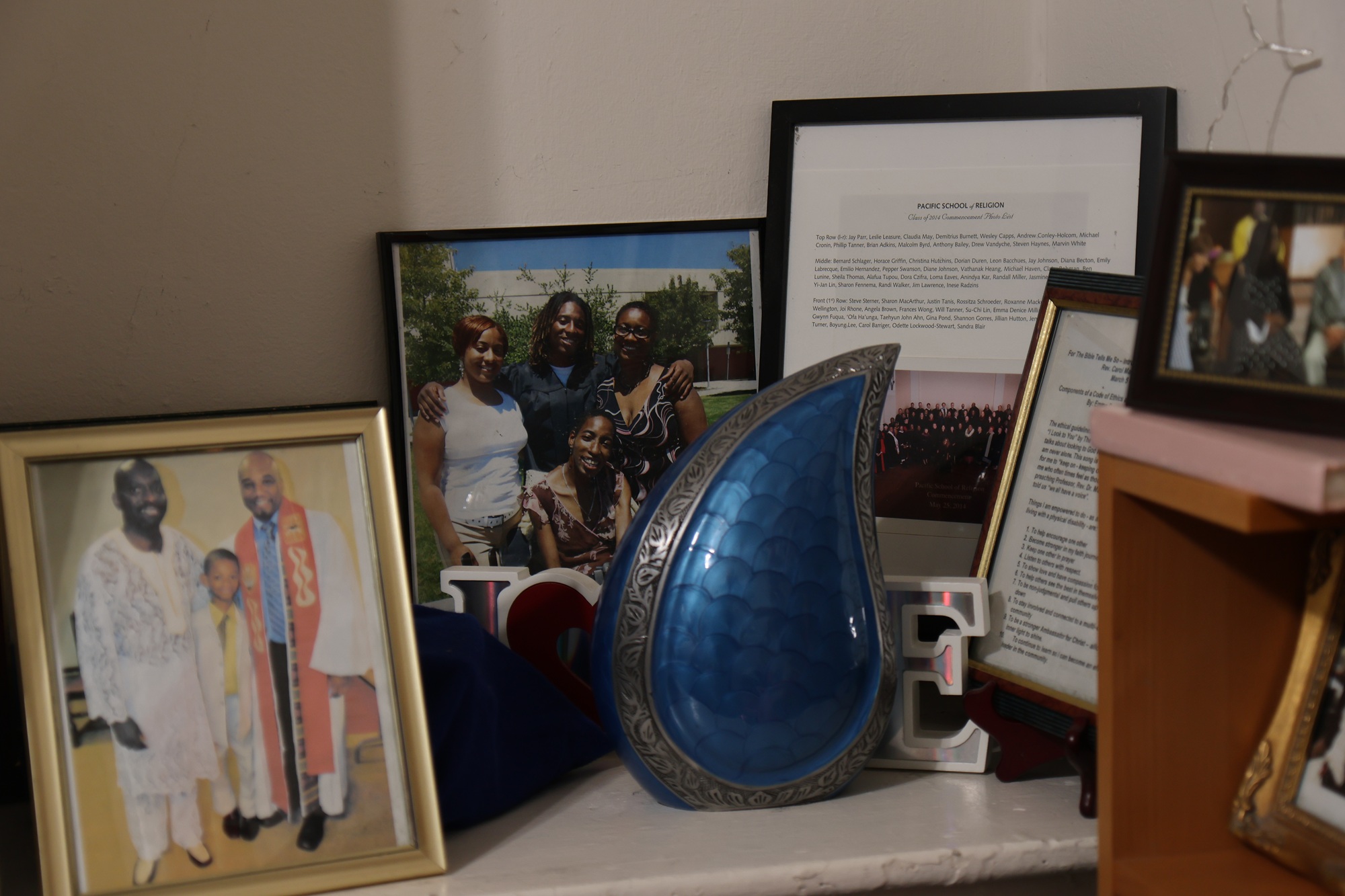 Photos of Emma Denice Milligan with friends and pastors sit in the corner of her room in Oakland on Dec. 12, 2025. (Courtesy of Hyeyoon Cho)