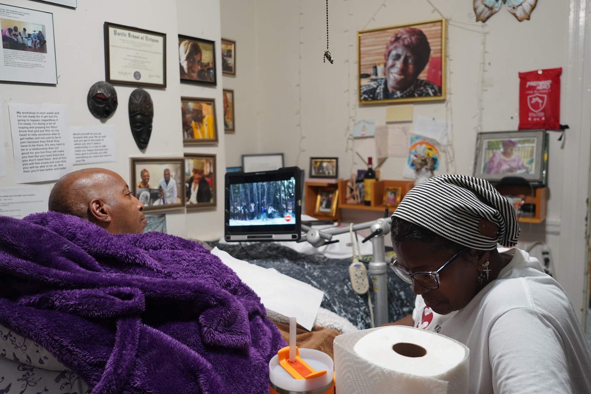 Emma Denice Milligan and her caregiver, Wanda Kincy, laugh in her Oakland home on Dec. 12, 2025. After Congress approved roughly $1 trillion in Medicaid cuts over the next decade, California advocates are worried about the future of home-based care covered by Medi-Cal.
