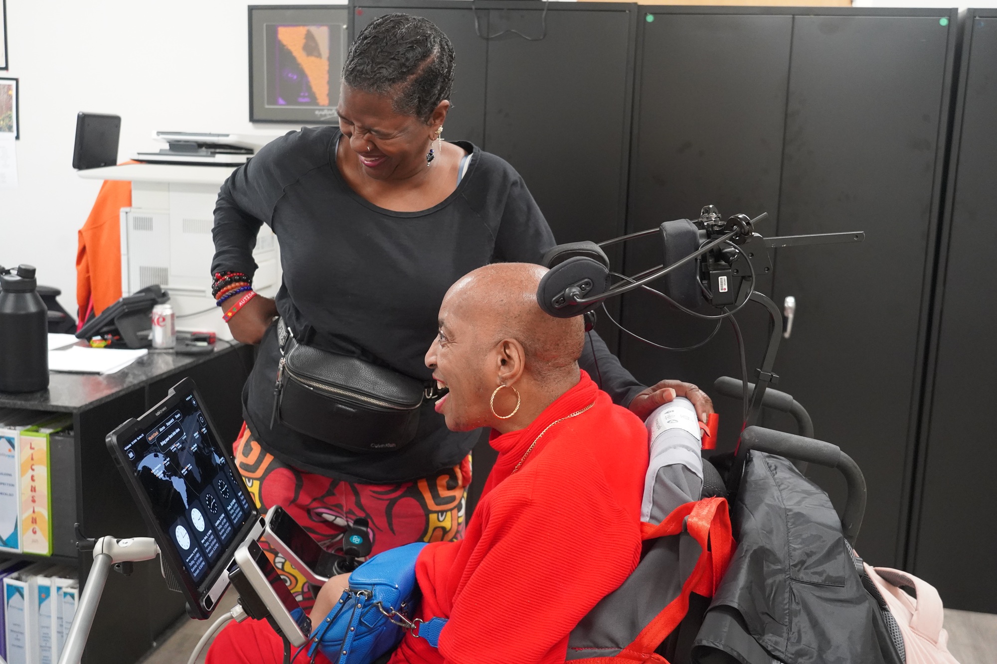 Emma Denice Milligan jokes with Wanda Kincy in Ability Now, an Oakland-based adult day center for people with disabilities, on Nov. 20, 2025. (Courtesy of Hyeyoon Cho)