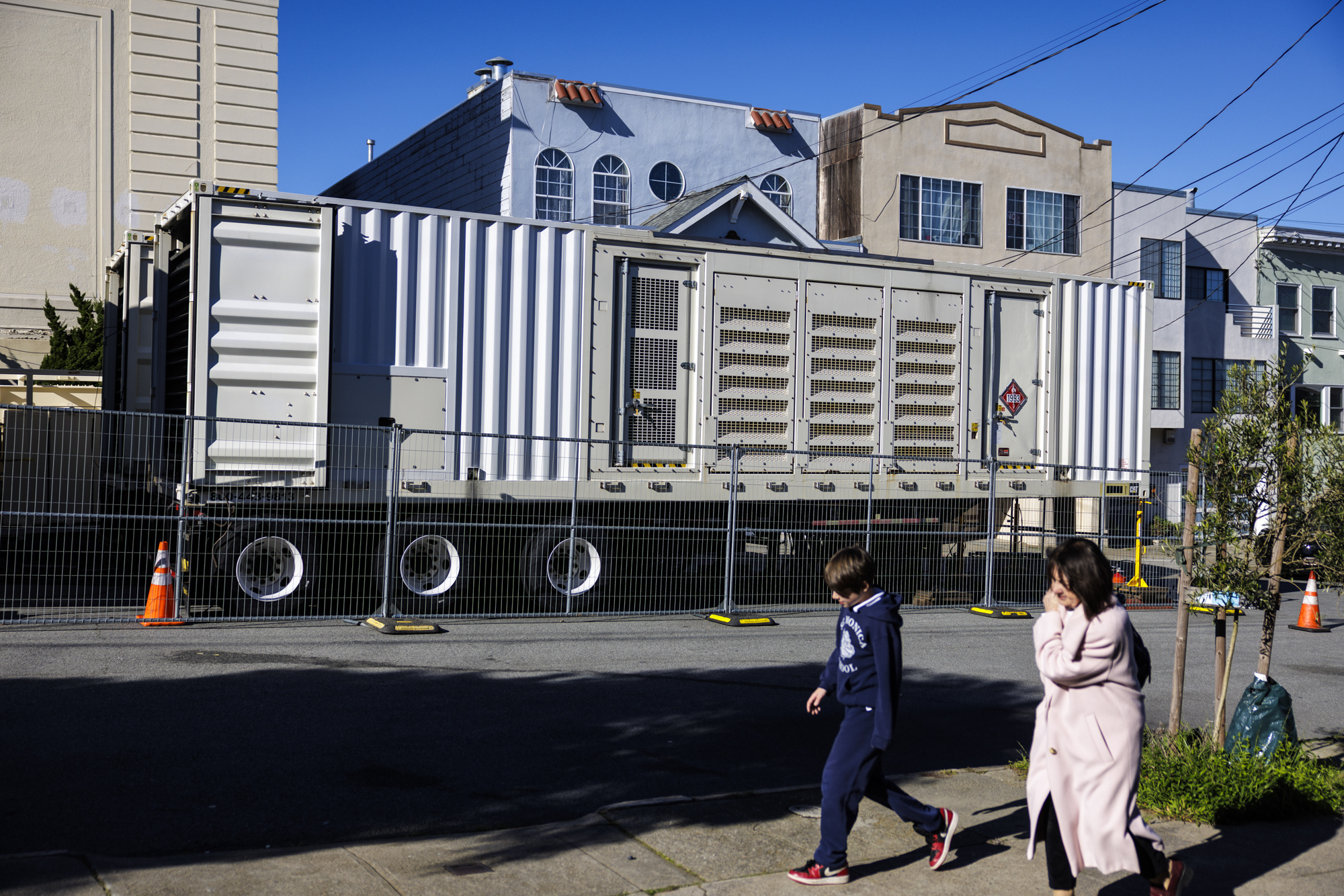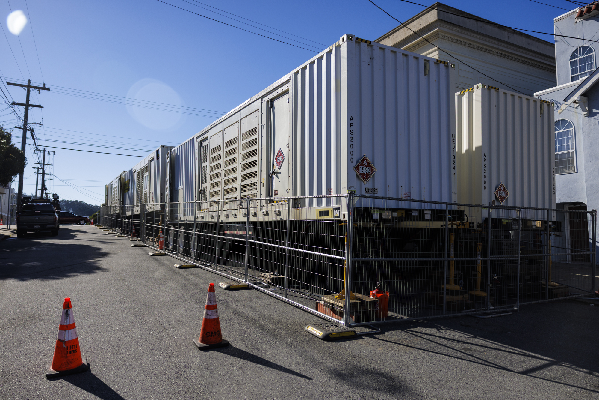 PG&E generators at 24th Street and Balboa in San Francisco on Jan. 16, 2026. (Martin do Nascimento/KQED)