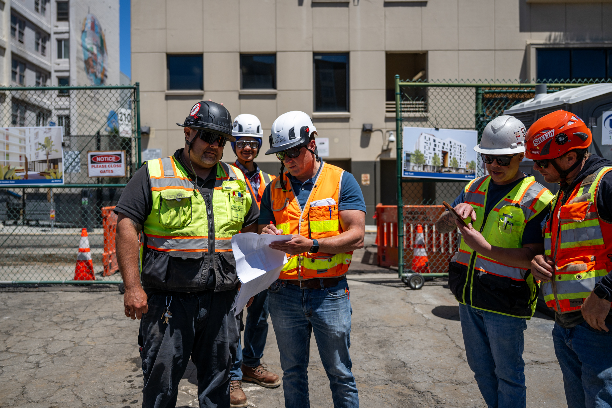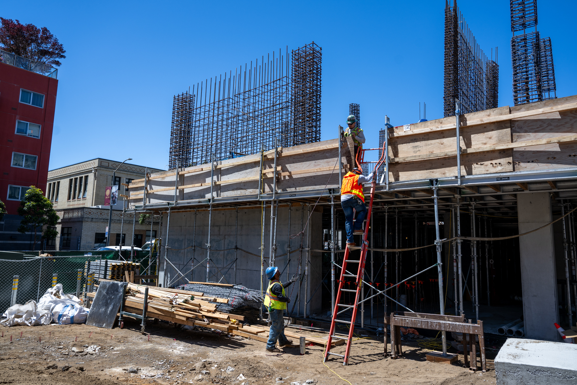 Construction workers build at 750 Golden Gate Ave. in San Francisco on June 18, 2025, during a groundbreaking ceremony marking the start of two affordable housing projects. One will deliver 75 units prioritized for SFUSD and City College educators, and the other at 850 Turk will add 92 family apartments. (Beth LaBerge/KQED)