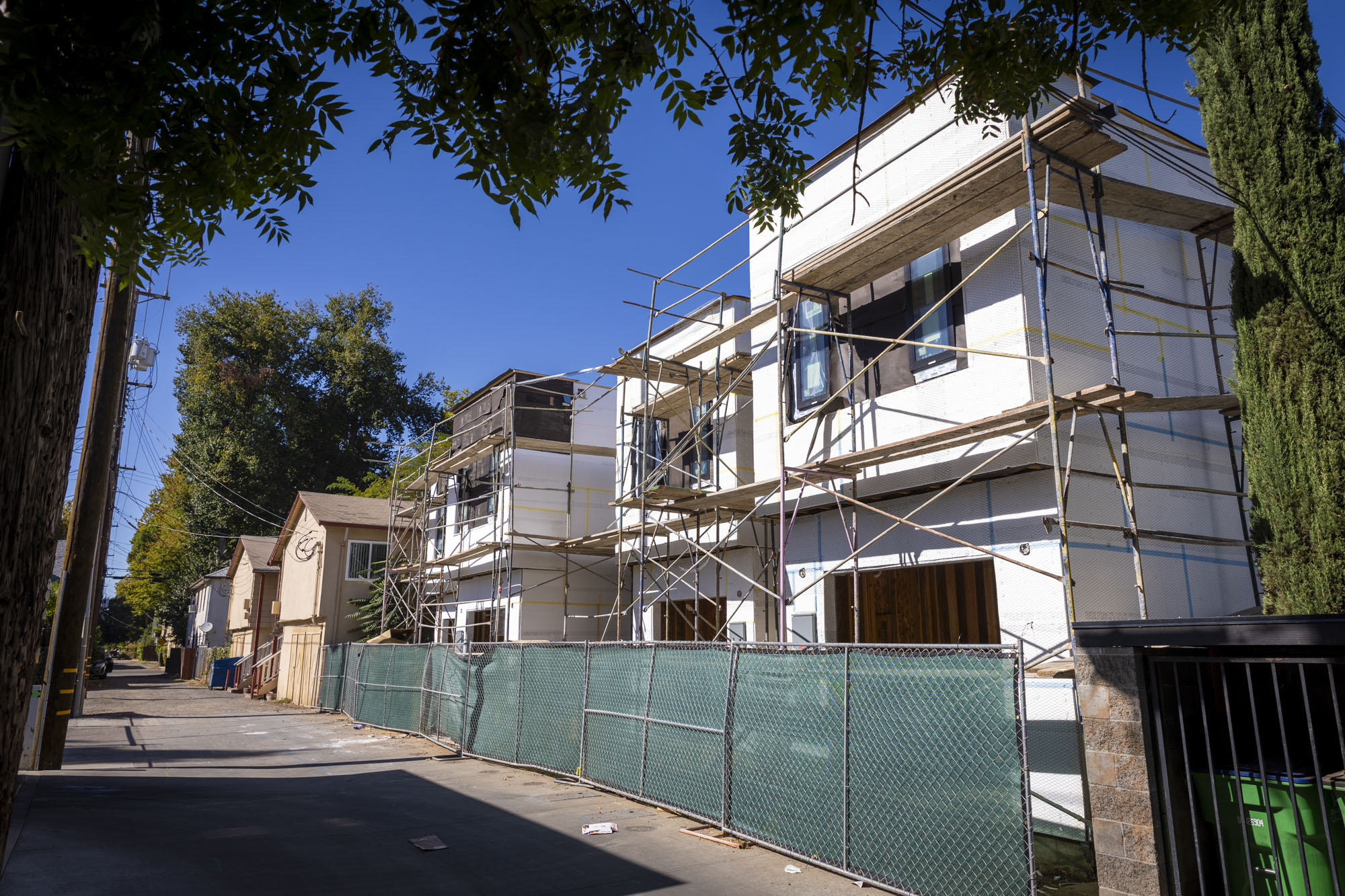 A site of new middle housing units is under construction at 2824 D St. in Sacramento on October 7, 2025. Developers are reviving “middle housing” such as duplexes and cottage clusters, but say California’s rollout of the new rules has been anything but smooth. (Tâm Vũ/KQED)