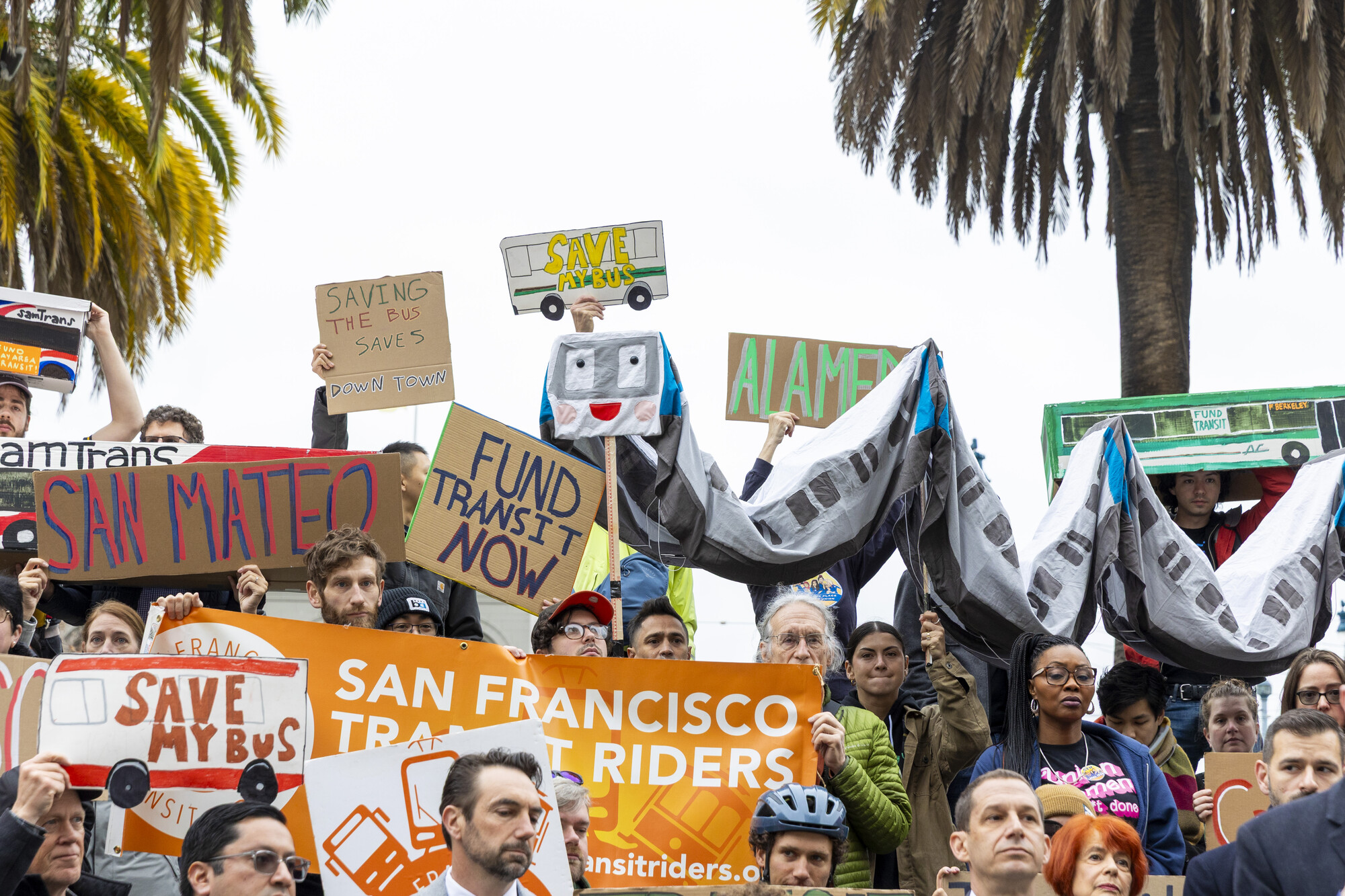 Flanked by dozens of train and bus advocates carrying signs reading, “Fund The Bus” and “Transit Reduces Traffic,” local politicians from across the Bay Area on Friday marked the start of a campaign to save the region’s public transit.