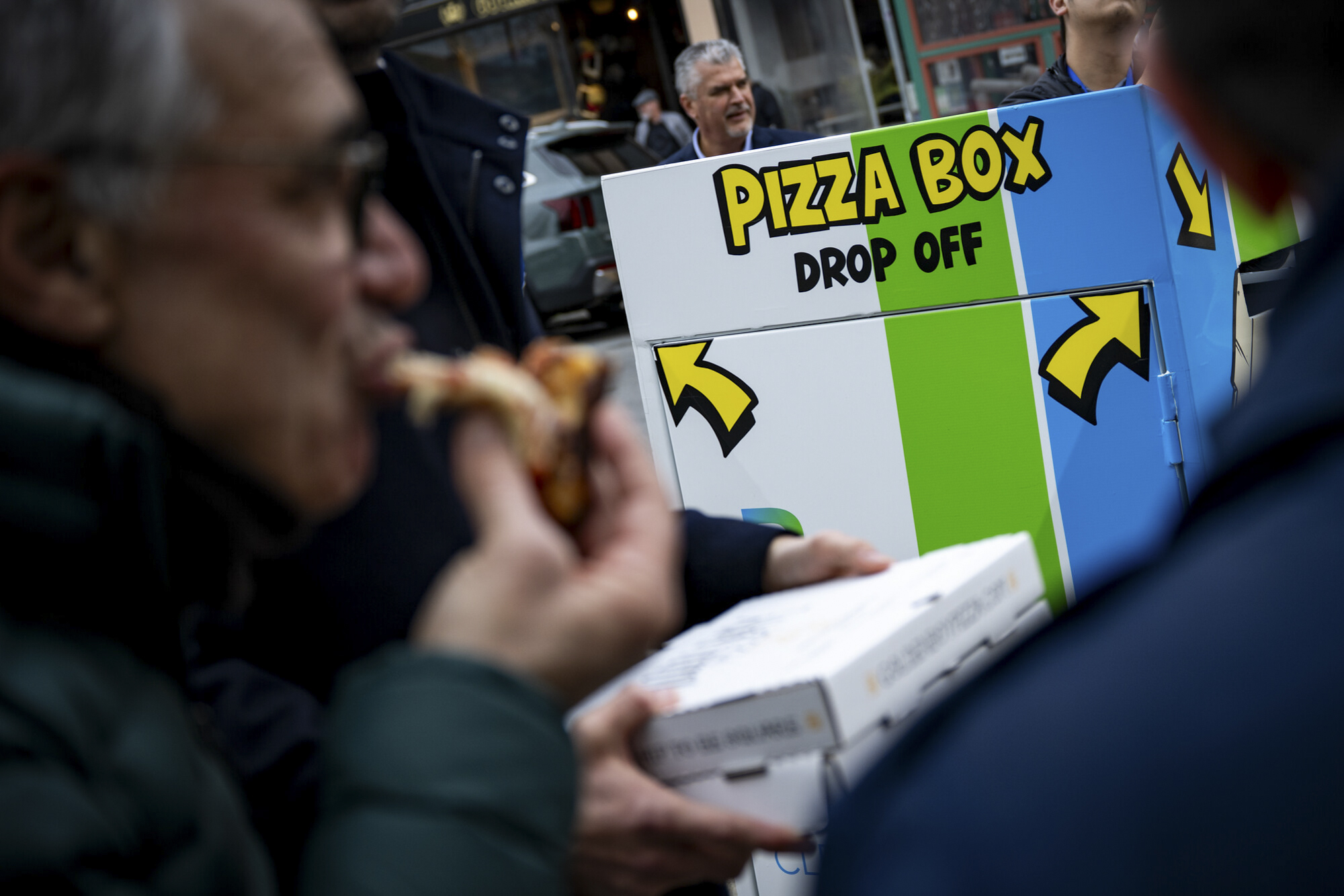 So far, it seems like residents are enjoying the novelty. After Jeff Garfield finished his slice around 1 p.m. Friday, he dropped his empty container in one of the brand-new bins.