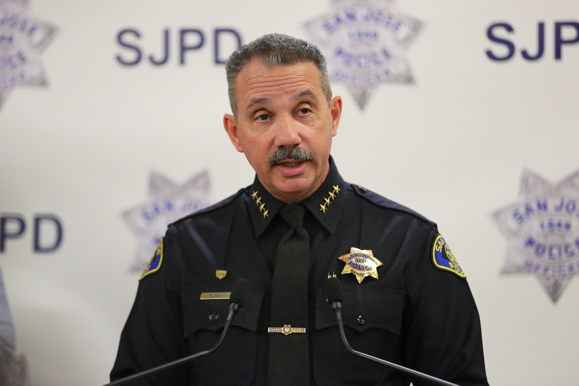 San José Police Chief Paul Joseph speaks to the media during a Jan. 22, 2026 press conference about a police shooting in downtown that occurred Wednesday. (Joseph Geha/KQED)