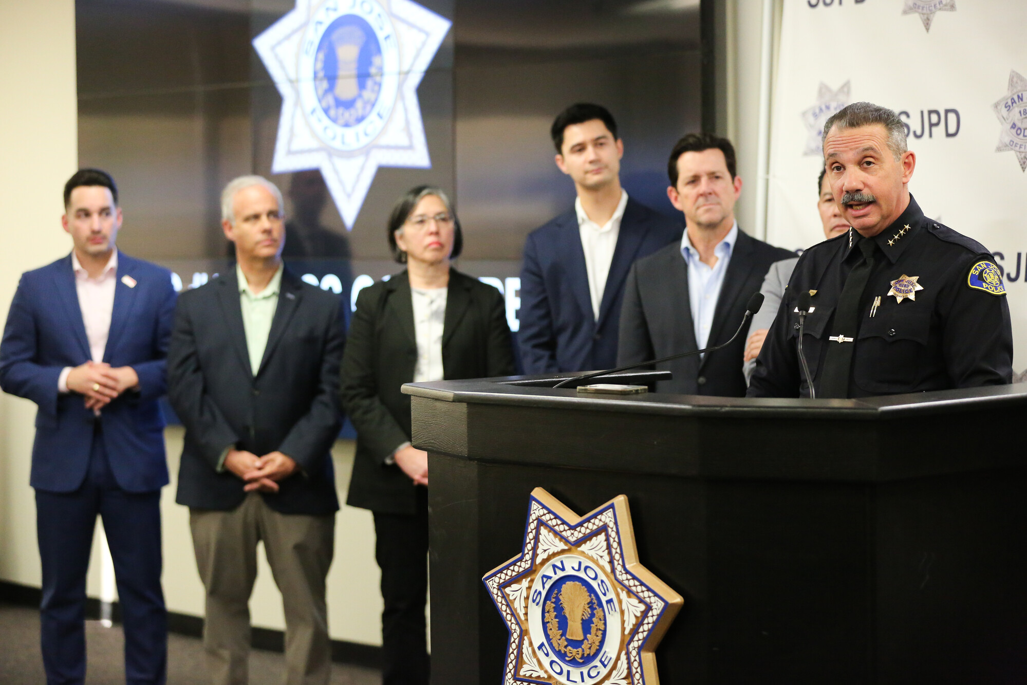 Members of the San José City Council listen as San José Police Chief Paul Joseph speaks to the media during a Jan. 22, 2026 press conference about a police shooting in downtown that occurred Wednesday. (Joseph Geha/KQED)