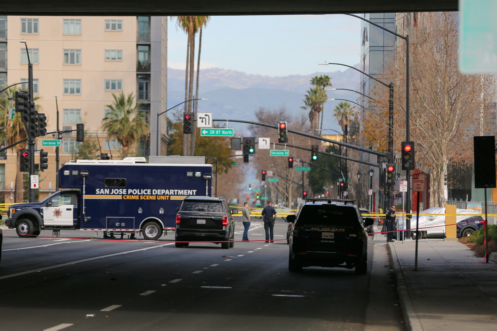 “That suspect was declared deceased at the scene,” San José Police Sgt. Jorge Garibay told reporters Wednesday evening. It wasn’t clear whether the man was killed by police gunfire, by the police vehicle, or by a combination of the two.