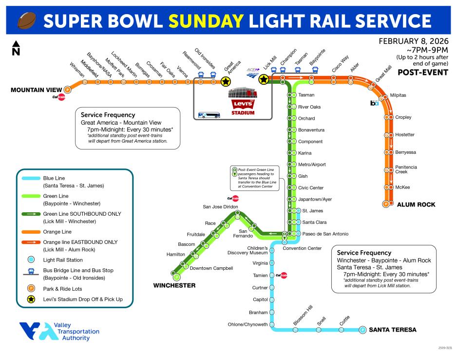 Caption: Post-event VTA services on Super Bowl Sunday, from 7 p.m. to 9 p.m. Image from Valley Transportation Authority.