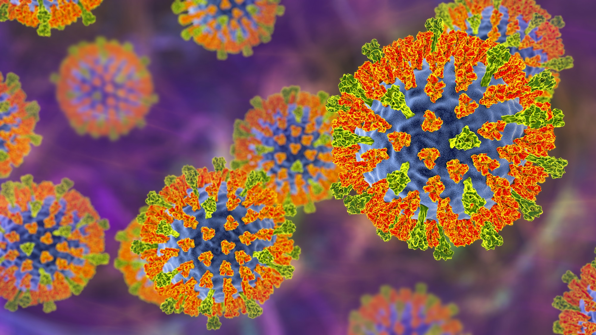 Measles virus particle, illustration. This virus, from the Morbillivirus group of viruses, consists of an RNA (ribonucleic acid) core surrounded by an envelope studded with surface proteins haemagglutinin-neuraminidase and fusion protein, which are used to attach to and penetrate a host cell. (Kateryna Kon/Science Photo Library)