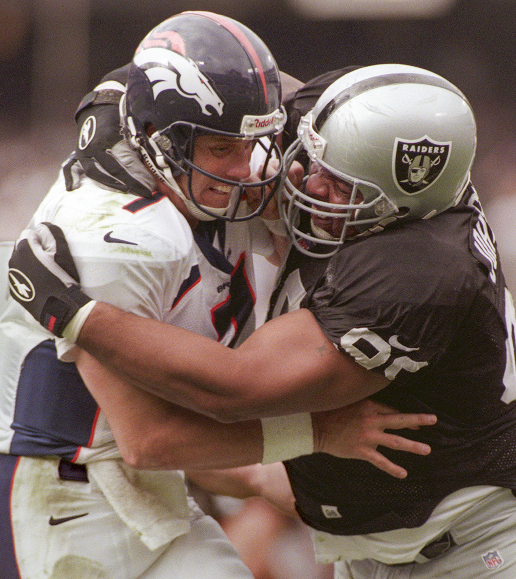 Raiders DT Kevin Johnson hauls down Broncos QB John Elway on Oct. 19, 1997. Johnson was believed to have been living at a Los Angeles homeless encampment when he was found dead in January 2026 with stab wounds. (Meri Simon/MediaNews Group/Mercury News via Getty Images)