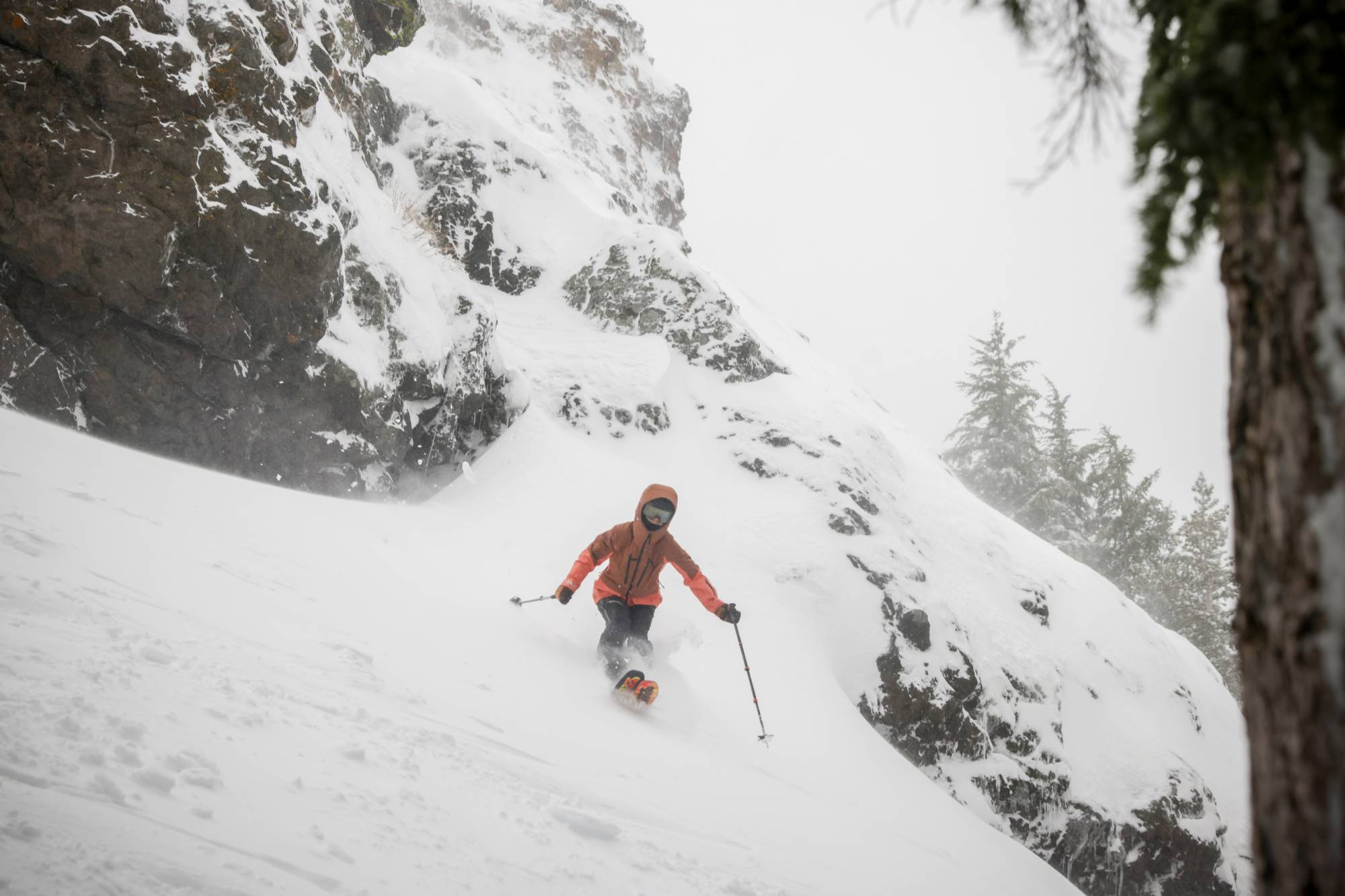 Professional skier Molly Armanino lands Dan's Cliff at Kirkwood Ski Resort in Kirkwood, Calif. on Saturday, Jan. 3, 2026. Heavy snowfall beckons skiers, but challenge motorists as a weather system smashes into the Tahoe region.  ((Photo by Brontë Wittpenn/San Francisco Chronicle via Getty Images))