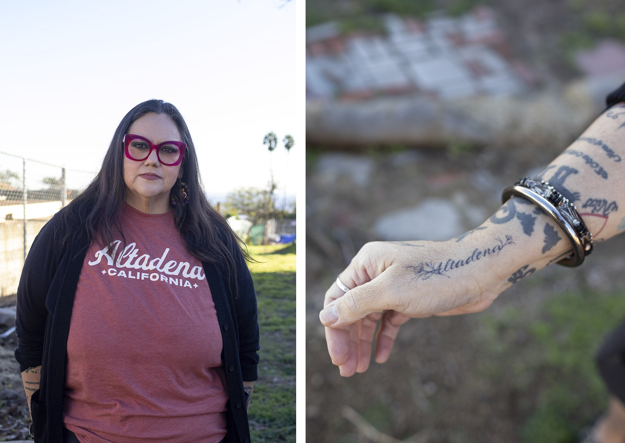 Left: Melissa Lopez photographed a year after her home in Altadena, California was destroyed by the Eaton fire. Right: Melissa Lopez shows the Altadena tattoo she got after the fires. Photographed in Altadena, CA, on Dec. 28, 2025. (James Bernal/KQED)