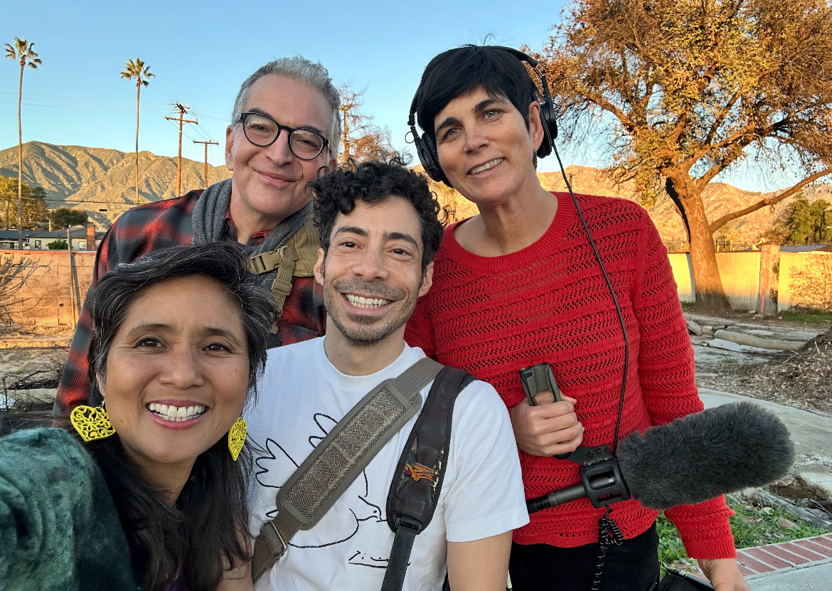 From top left: Steven Cuevas, artist Alma Cielo, photographer James Bernal and journalist Sasha Khokha pose for a selfie on Dec. 28, 2025 at the site of Cielo’s former home and studio, which were completely destroyed in West Altadena during the Eaton fire. (Courtesy Alma Cielo)