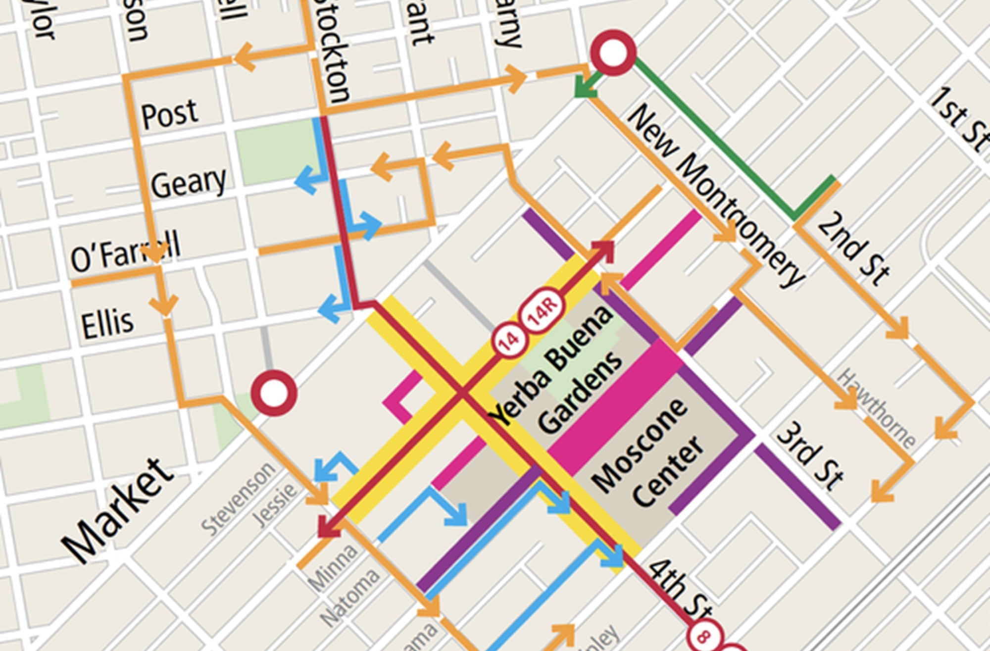 Several areas in San Francisco will experience road closures around the Super Bowl, including streets around the Moscone Center which is hosting the Super Bowl Experience. (SFMTA/Bay Area Hosting Committee)