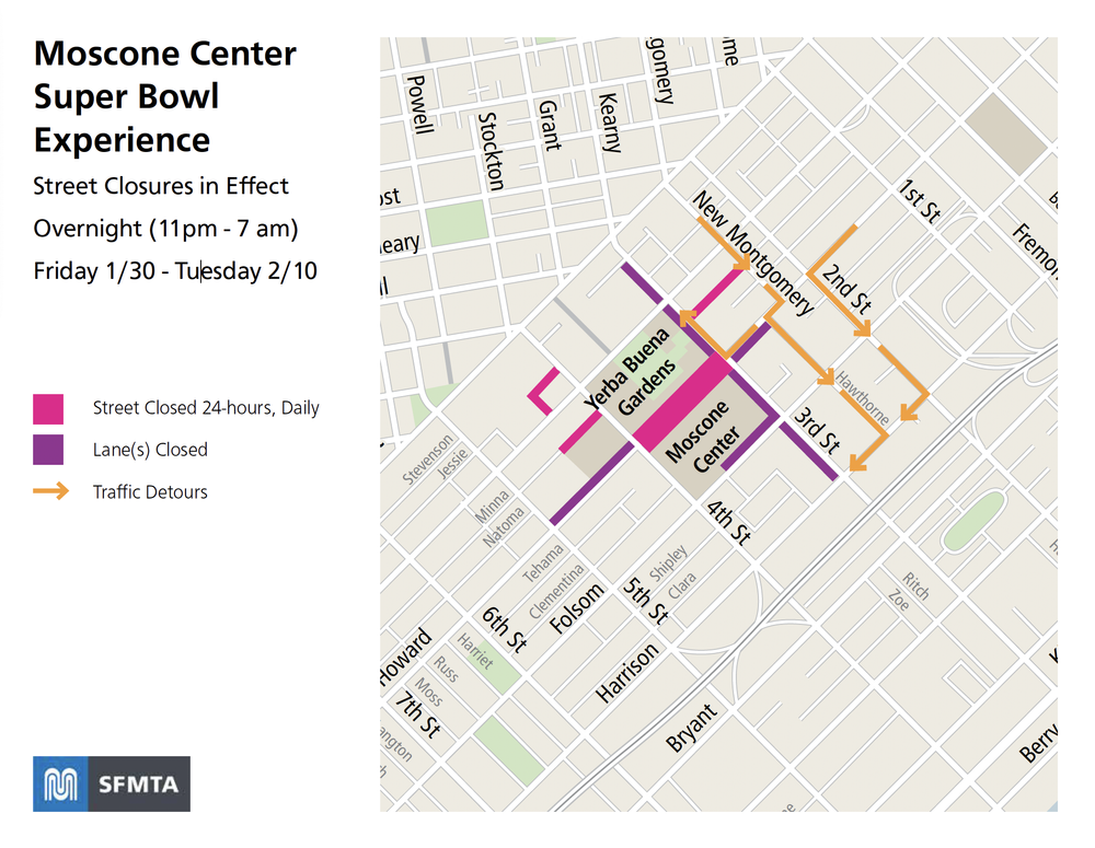 The Super Bowl Experience will be held at Moscone Center Feb. 3-7, and this means several closures in the surrounding area around Yerba Buena Gardens and Union Square: