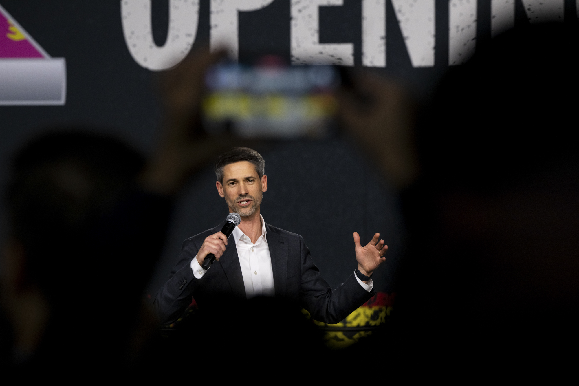 Mayor Matt Mahan gives remarks during Super Bowl Opening Night at the San José Convention Center in San José on Feb. 2, 2026. (Beth LaBerge/KQED)
