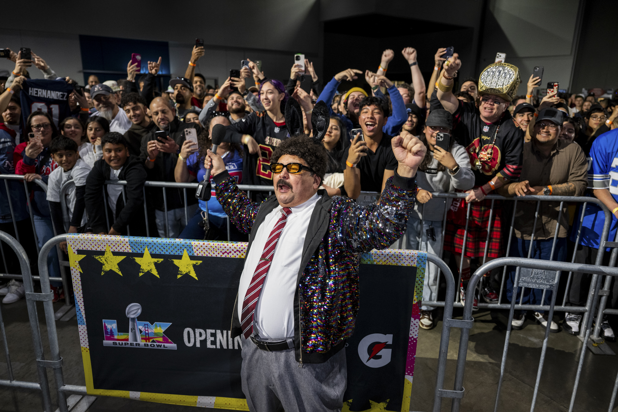 Guillermo Rodriguez cheers with fans during Super Bowl Opening Night at the San José Convention Center in San José on Feb. 2, 2026. (Beth LaBerge/KQED)