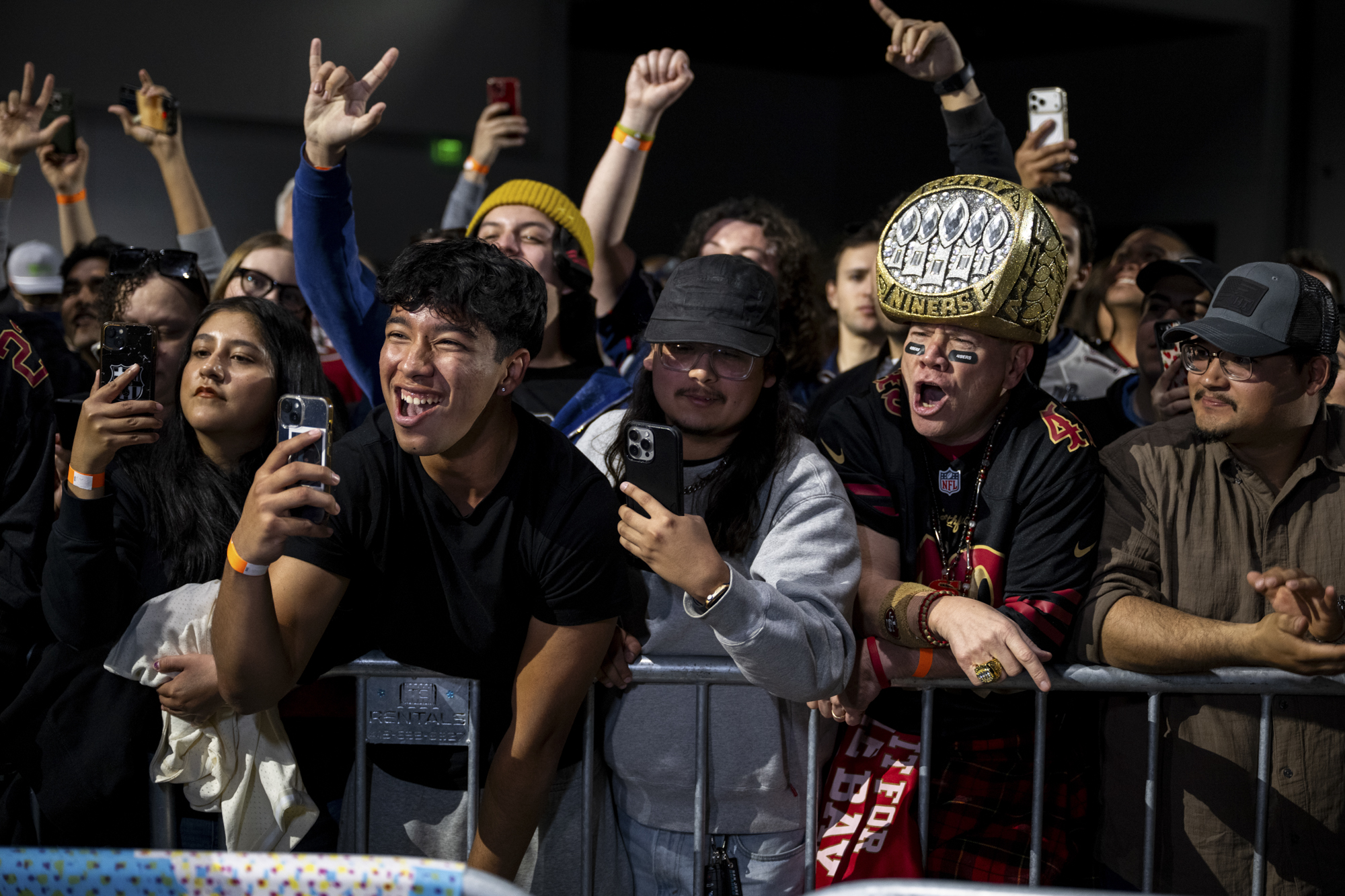 Super Bowl Opening Night, emceed by NFL RedZone host Scott Hanson, brought both teams out on stage with a small contingent of fans in attendance. Cheerleaders from both teams hyped the crowd. Famous streamers like Sketch, who gained popularity by posting videos of himself playing the video game Madden NFL 24, worked the crowd and took selfies with fans.